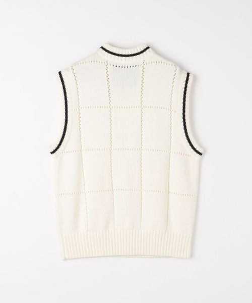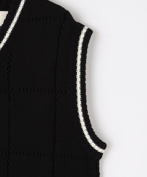 ネックと袖繰りのライン柄がアクセントになったニットベスト。