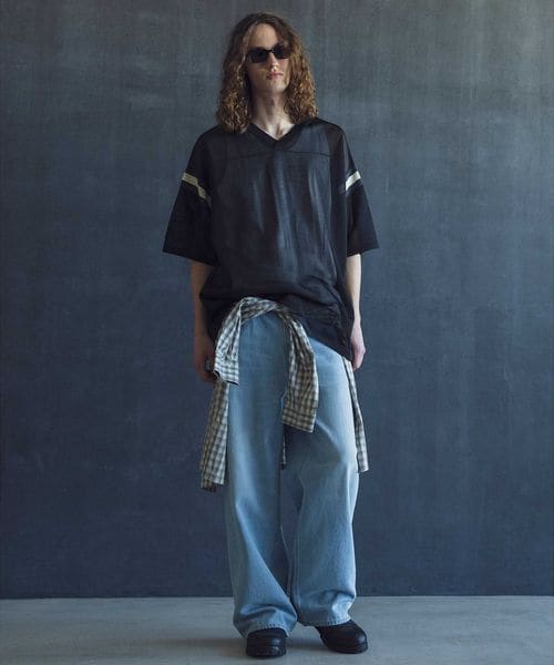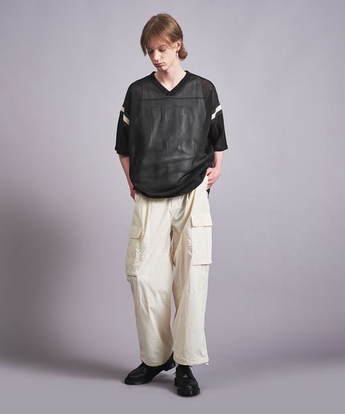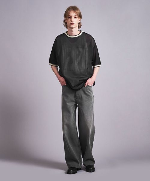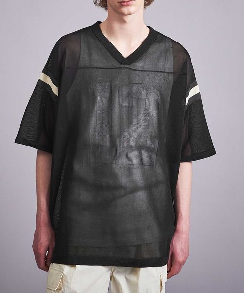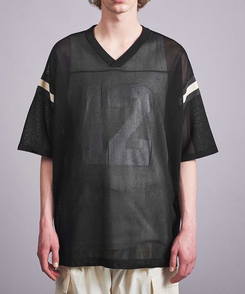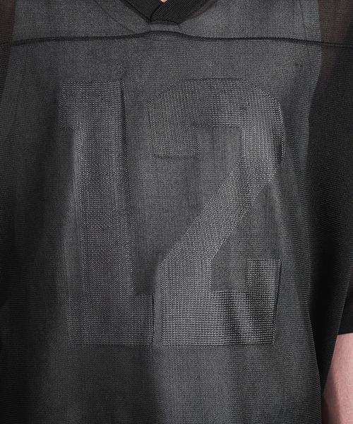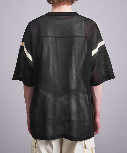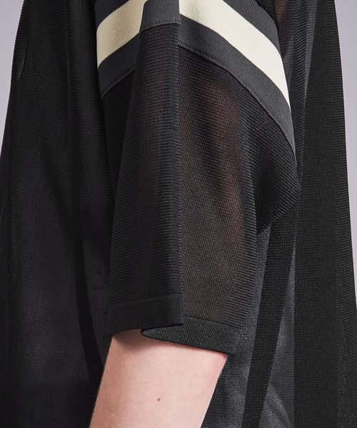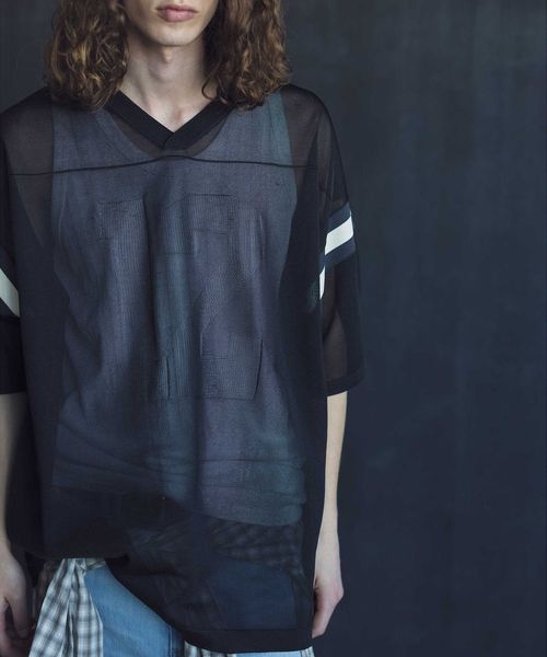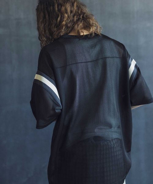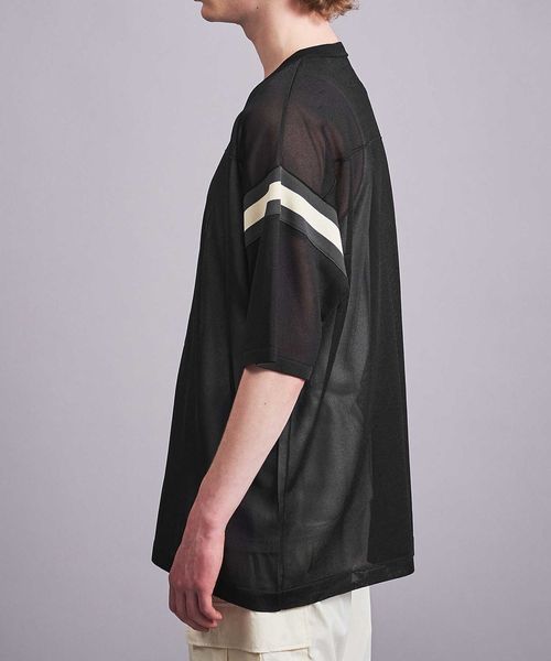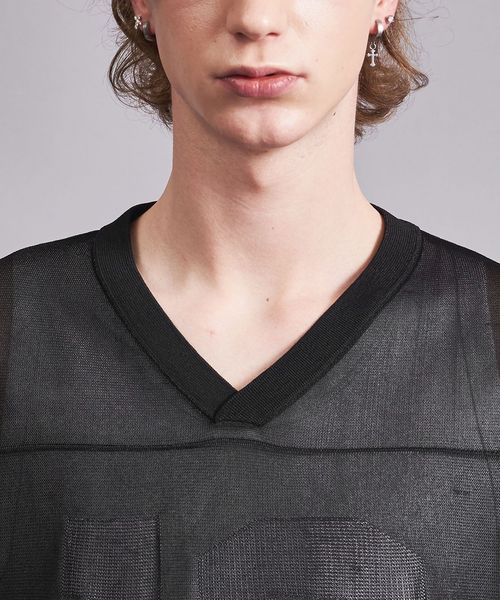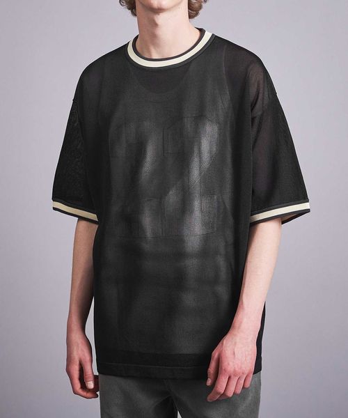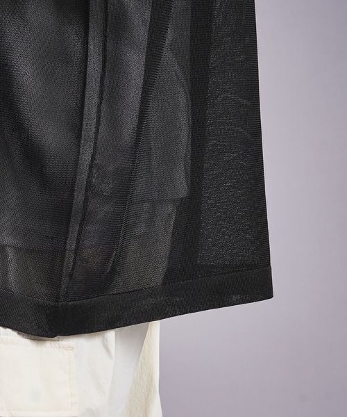 クリア感のあるナイロン/ポリエステルの糸を使用しシアー感のある組織で編上げたニットTシャツ。