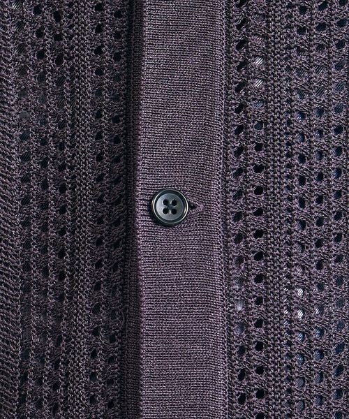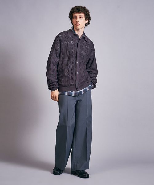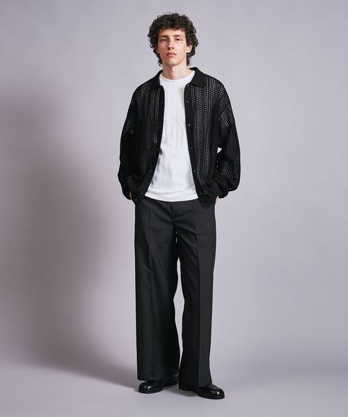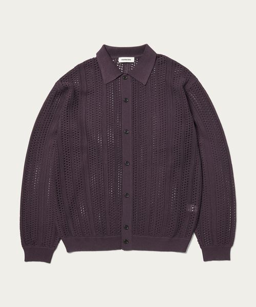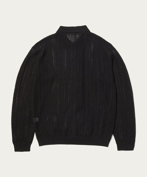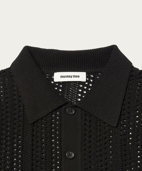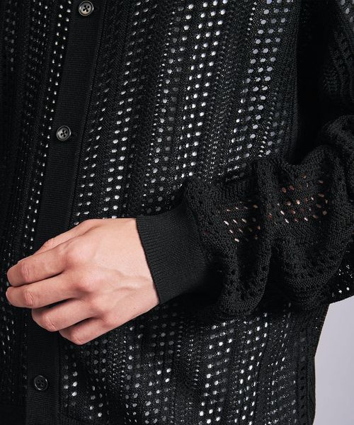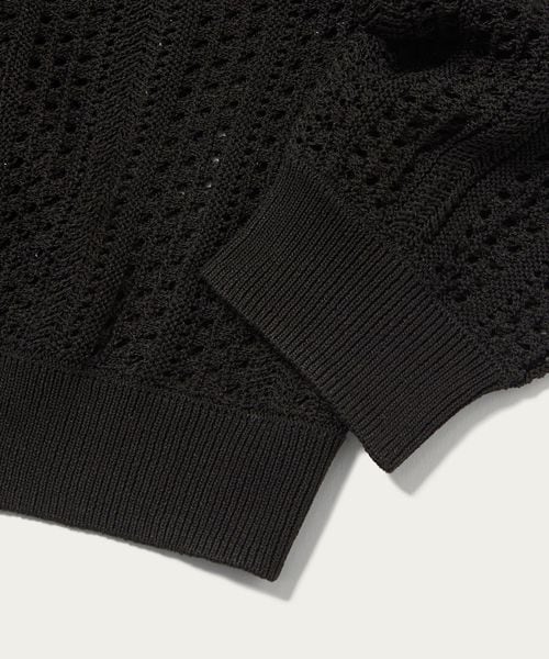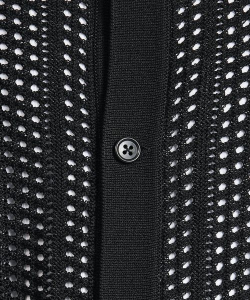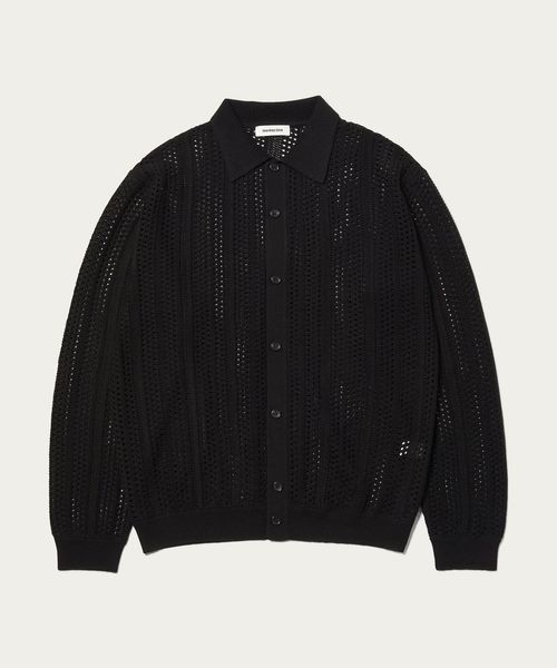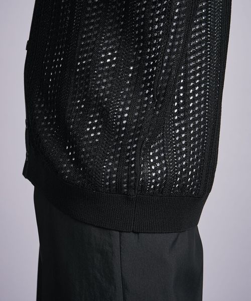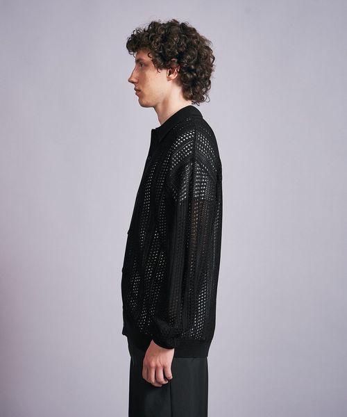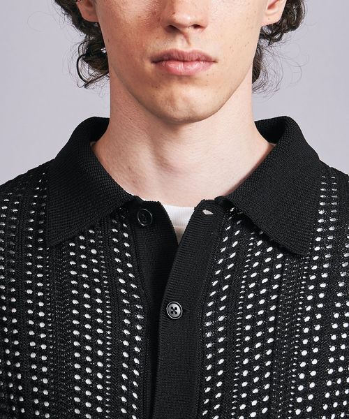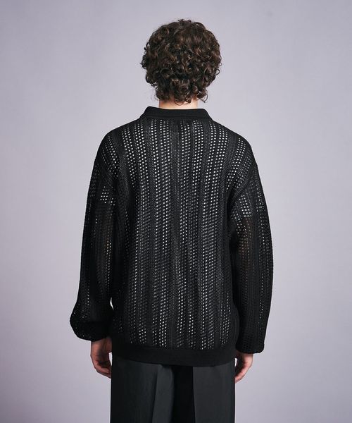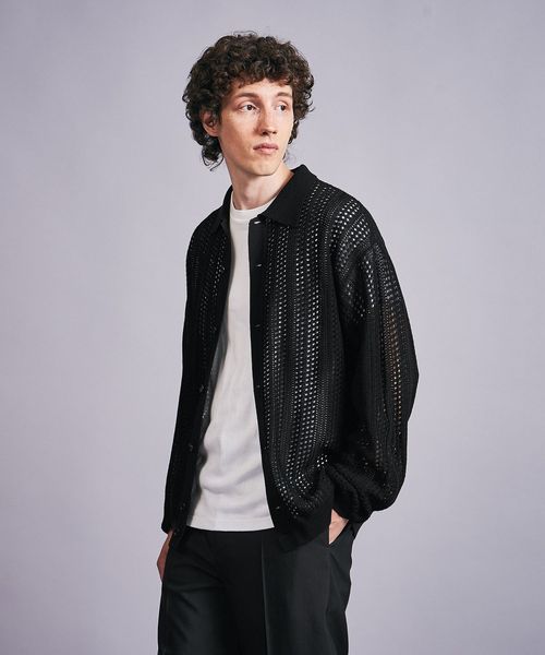 ポリエステルとアクリル混紡のドライタッチな糸を使用しシアー感のあるクロシェ風編地で作製したニットシャツ。