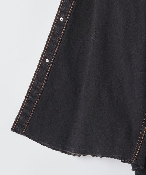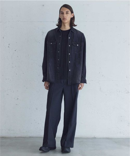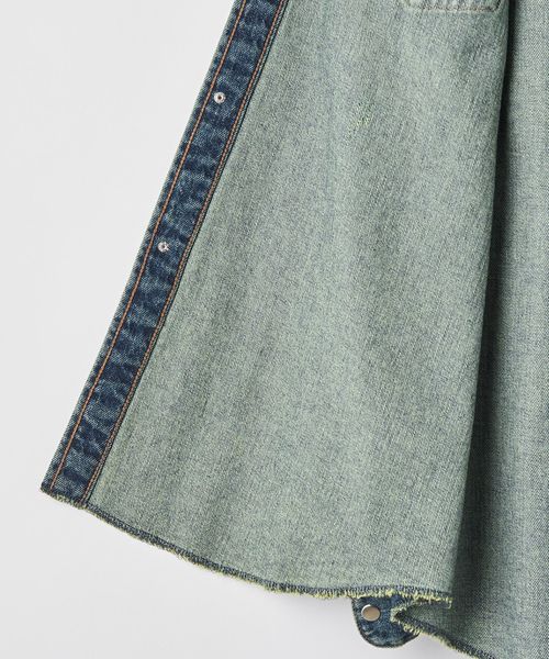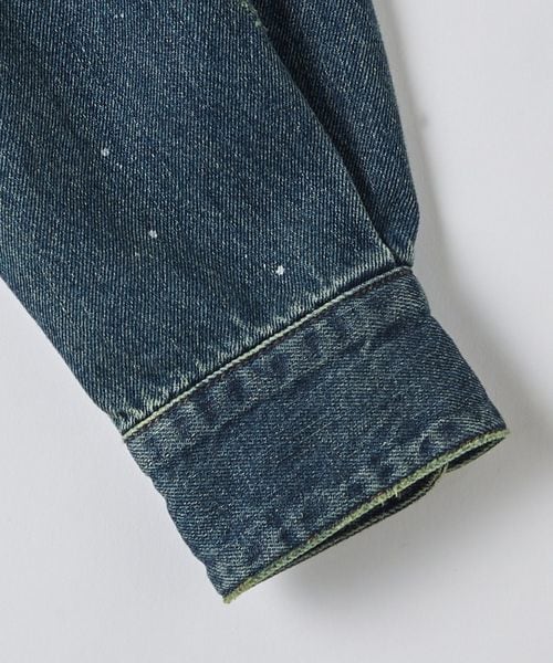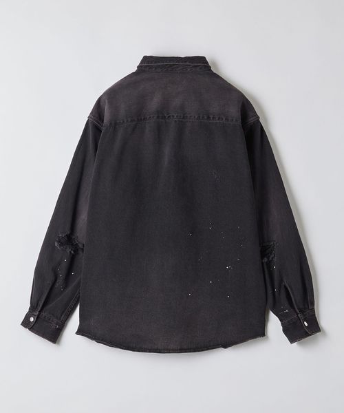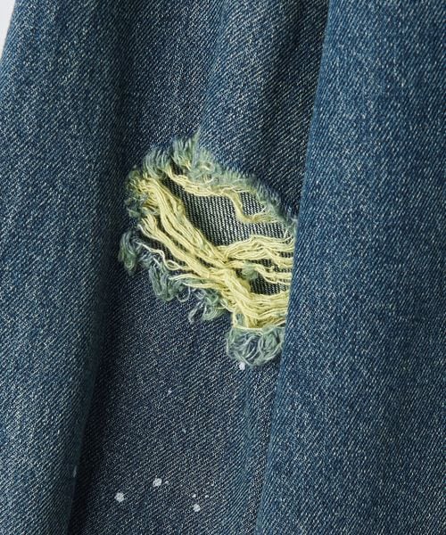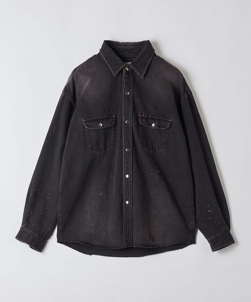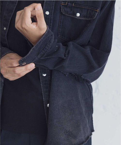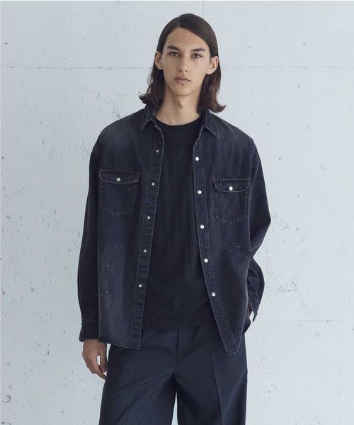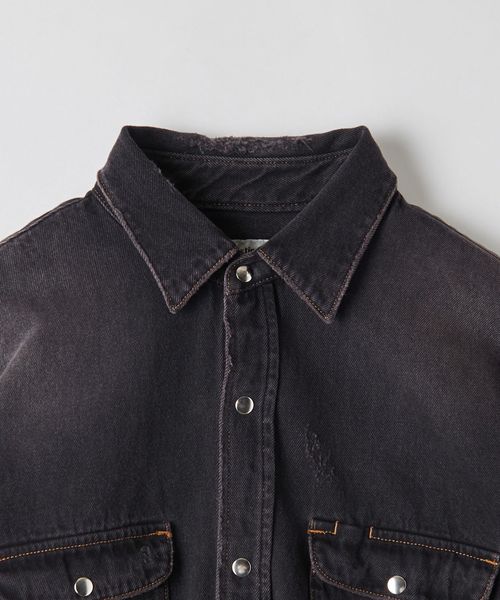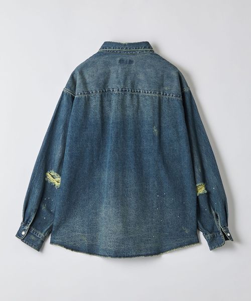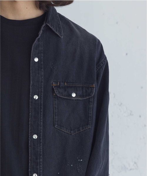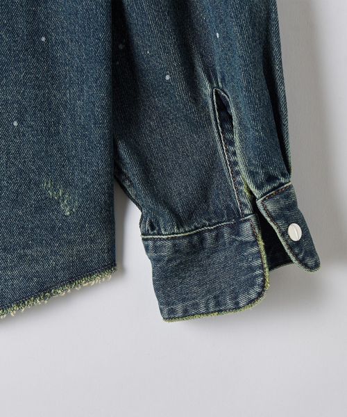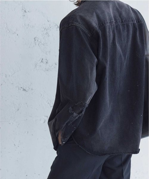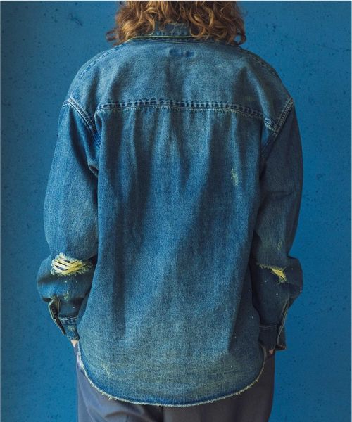 随所にダメージ加工と最終工程で製品染めを施すことでビンテージや古着のデニムシャツとは一味違うアイテムに仕上げています。