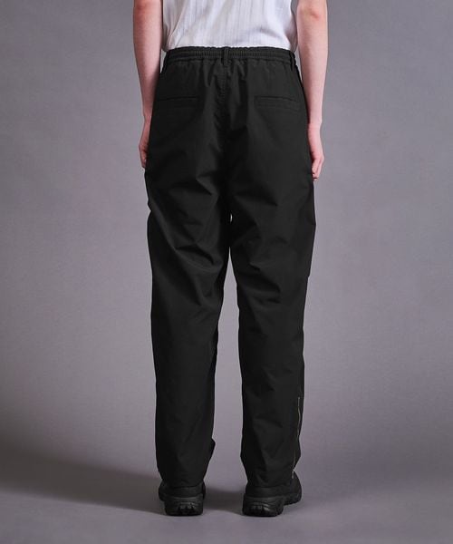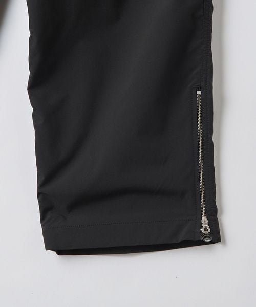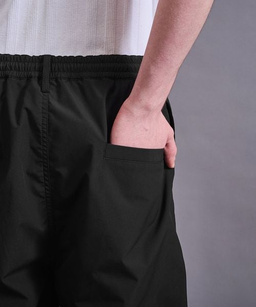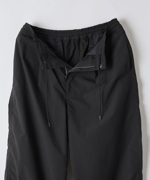 撥水加工が施されたしっかりとした肉感のポリエステルの二重織り組織の生地を採用したイージーパンツ。