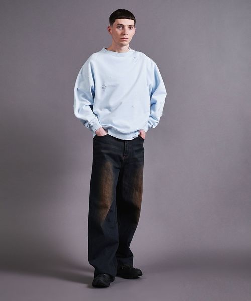 ゆったりしたサイズ感で随所にダメージ加工を施し一枚着でも気映えのするアイテムです。