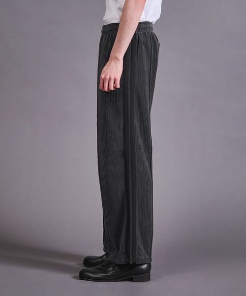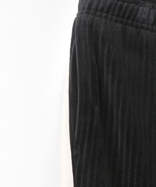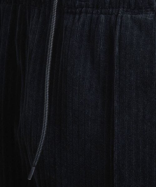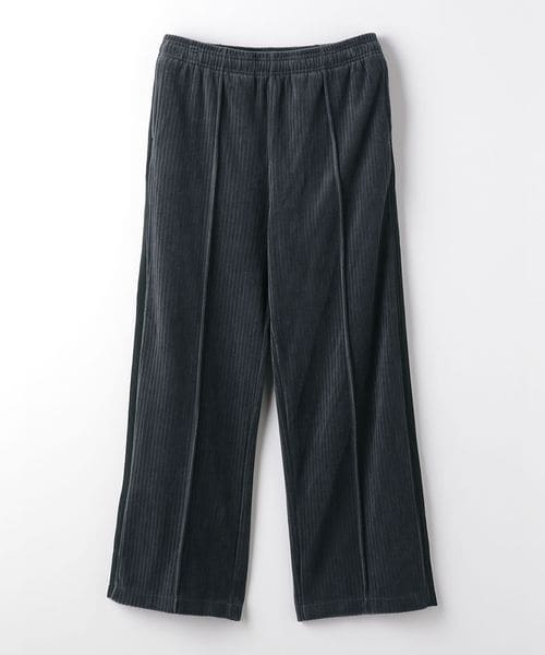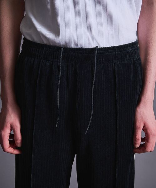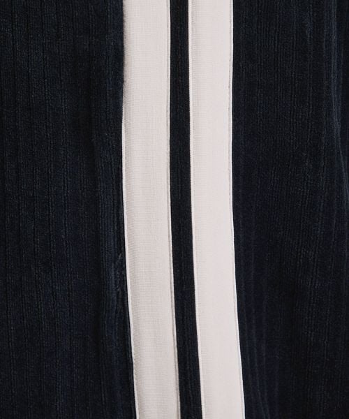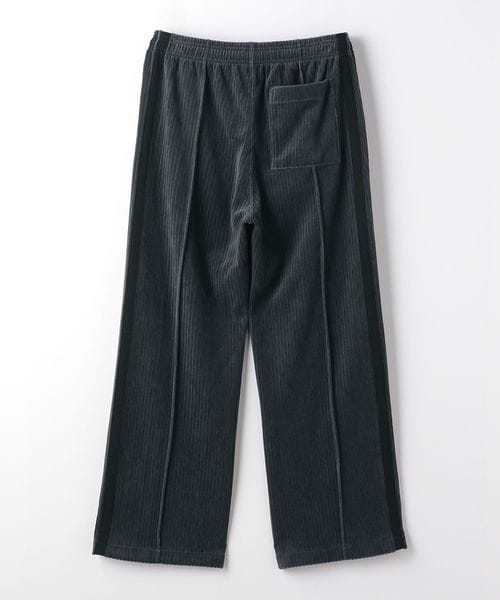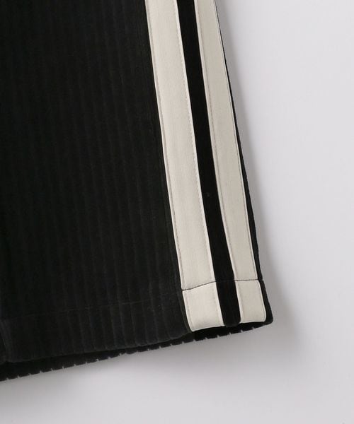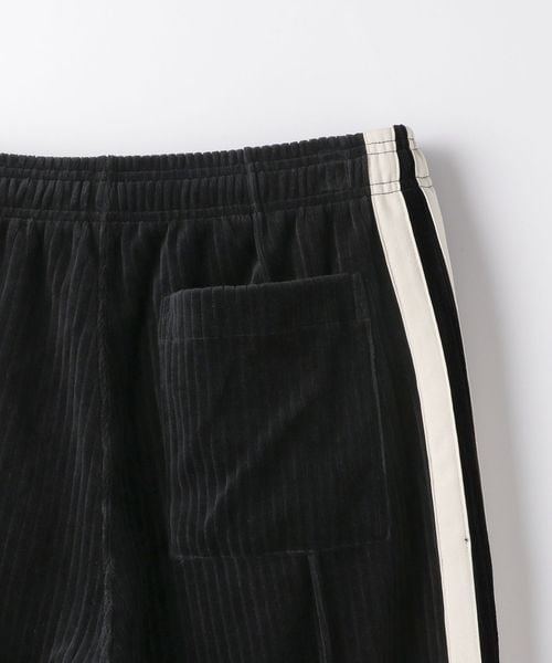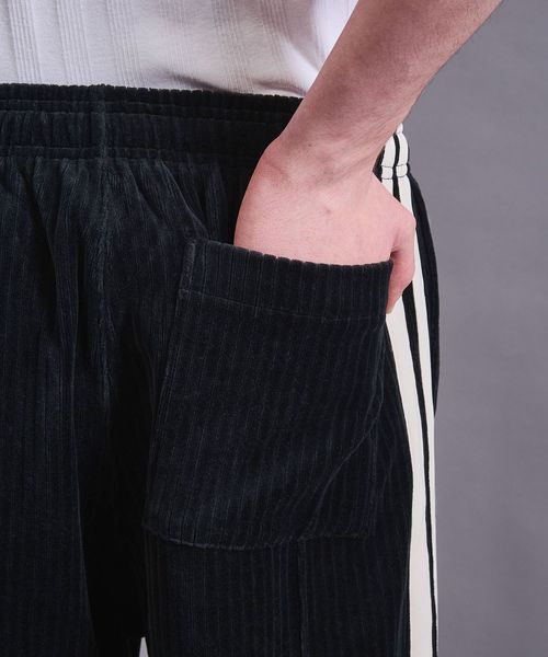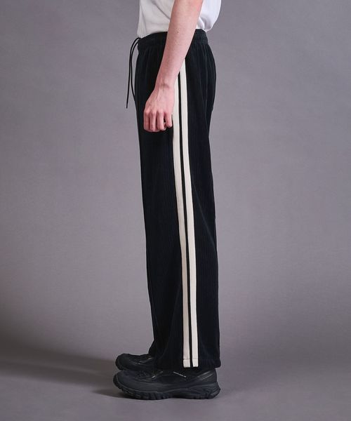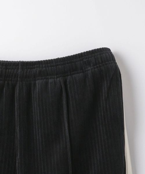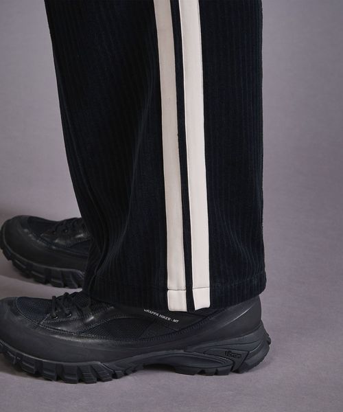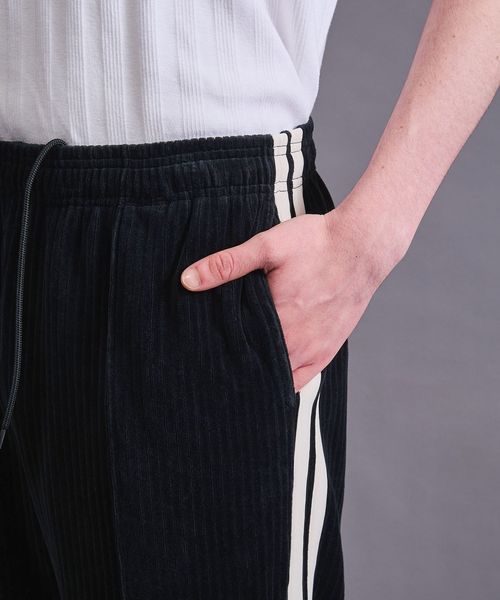 ストライプ状の畝のあるベロア素材を使用したトラックパンツ。