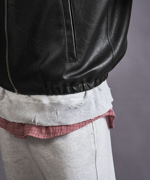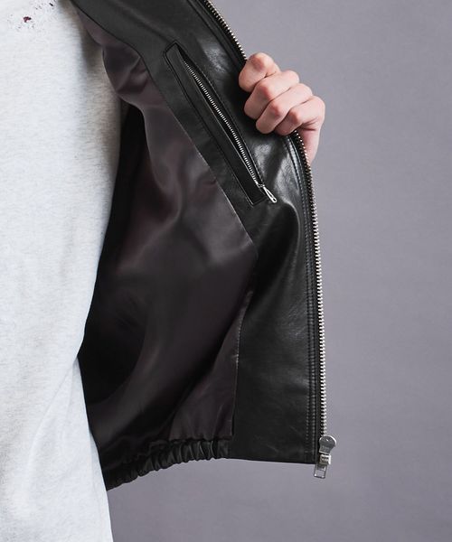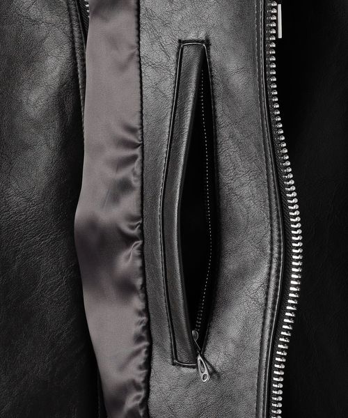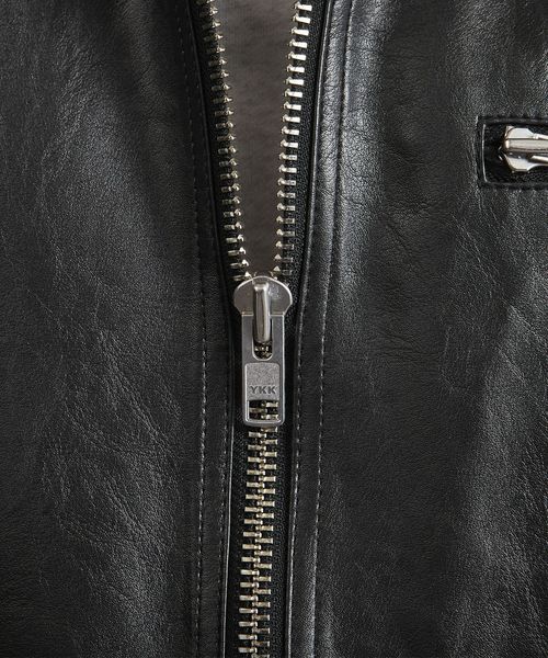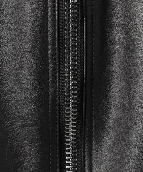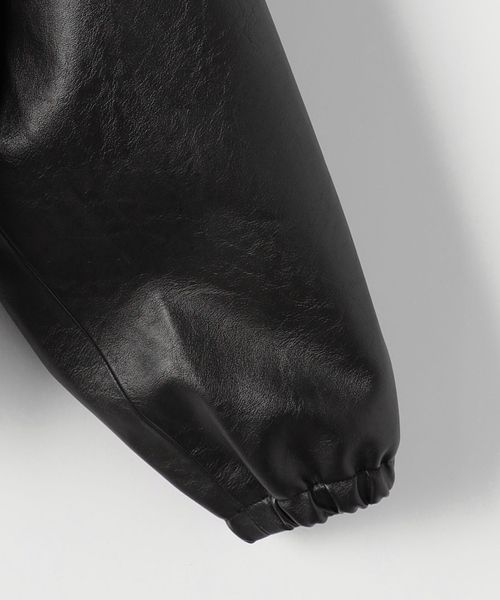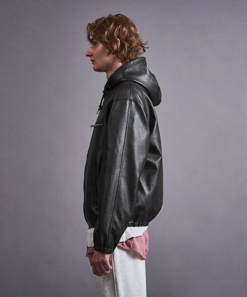 リアルレザーのような質感の合成皮革を使用したコンパクトな着丈のフルジップフードジャケット。