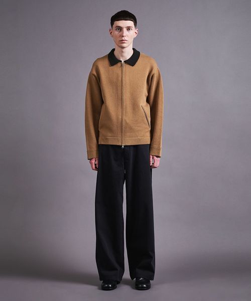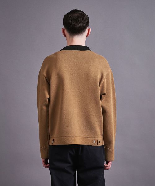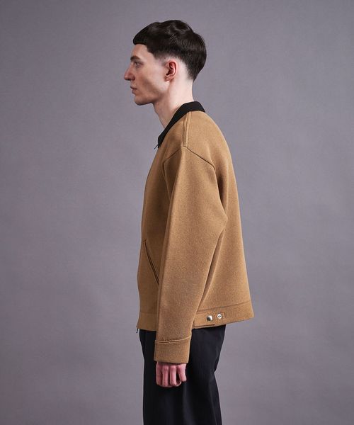 ワークウェアをニット生地で作製することで、きれい目なアウターとして仕上げたアイテムです。