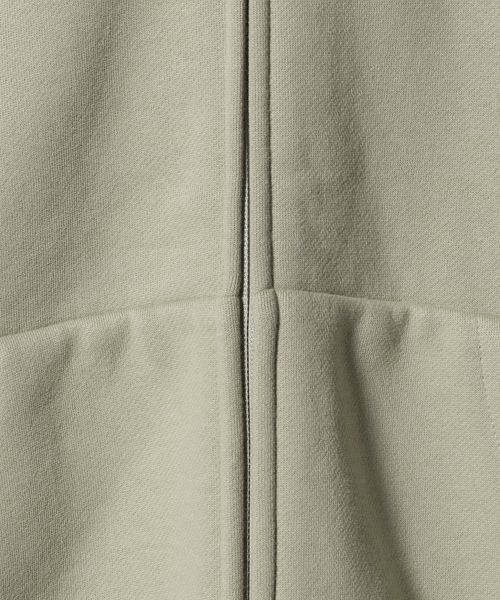 二重構造のフーディー、リブニットの袖口や裾、カンガルーポケットなど、細部にまでこだわったディテールが光ります。