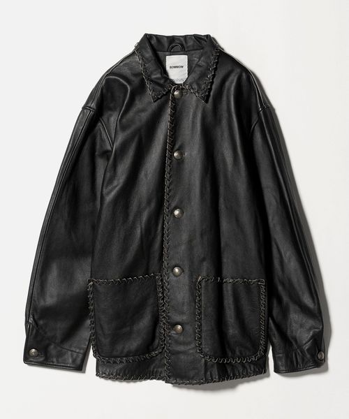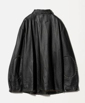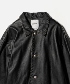 革端に平テープ状のレザーを巻いたカバーオール型のワークジャケット。