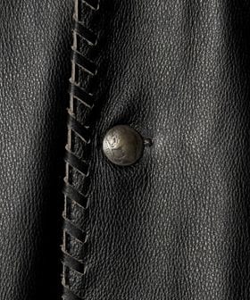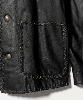 1900年代初頭の米セントコインを叩き出して仕立てたコンチョボタンがアクセントとなり、肘当て・ポケット・革端のレザーテープ(革紐)ワークが冴えるジャケットです。