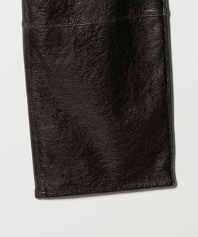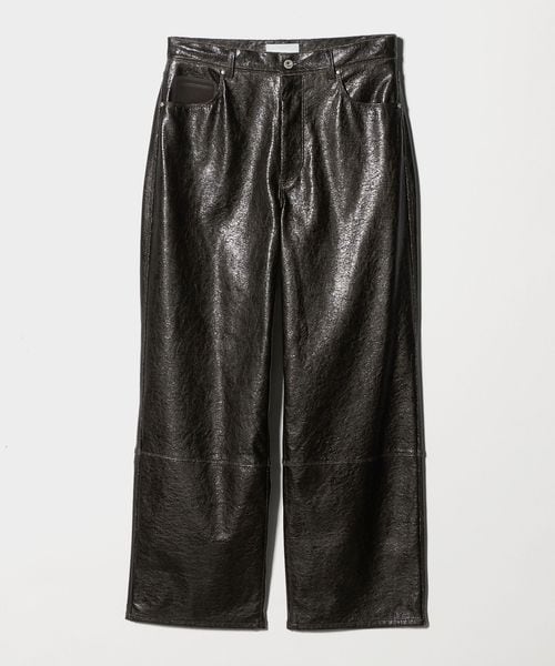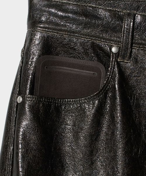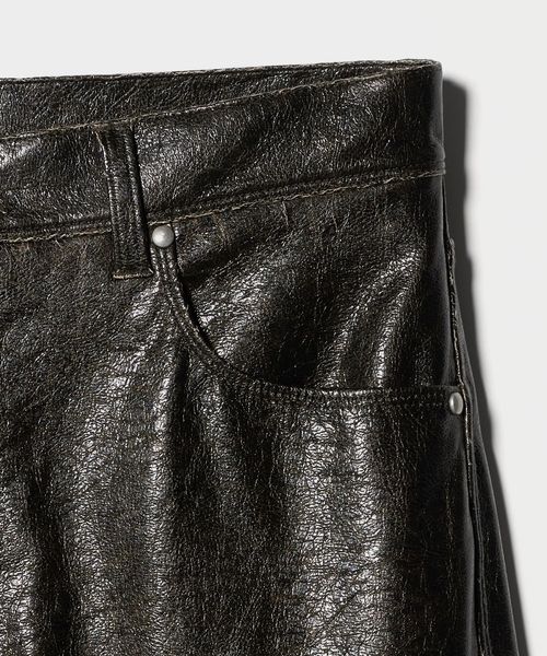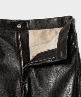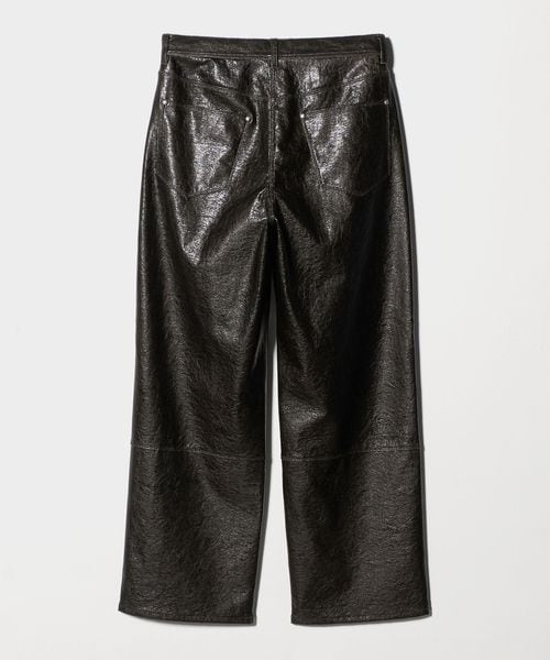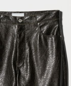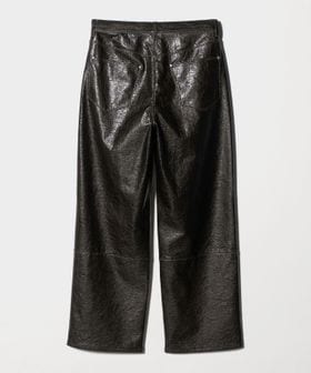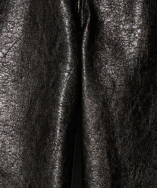 ハードにクラック(ひび割れ)したレザーのような加工を施したワイドパンツ。
