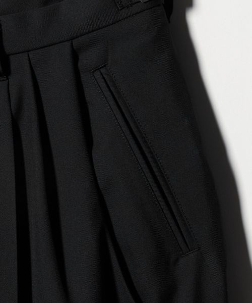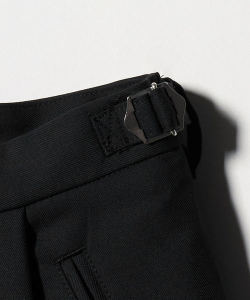 60番手双糸の高密度ギャバを使用した変形カーブレッグ2タックバギーシルエット。