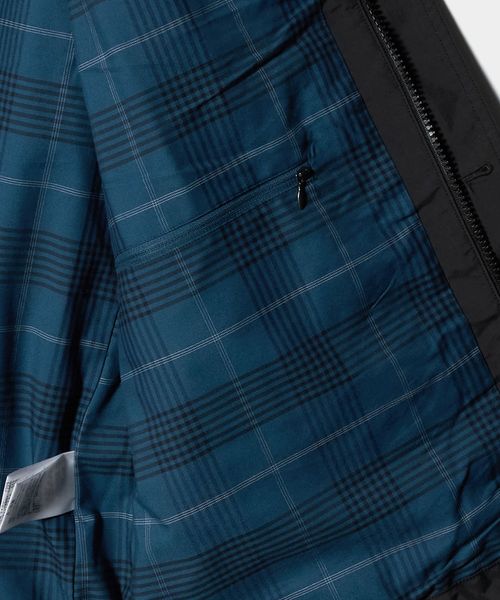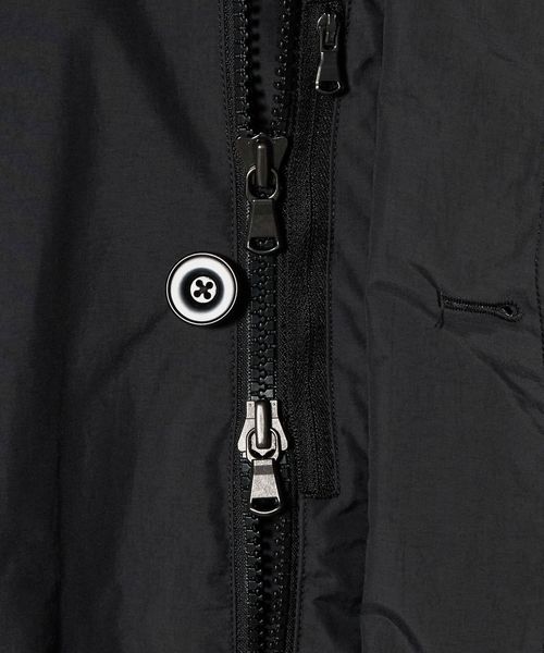 取り外し可能なフード付きで、左胸と右腰フラップ裏にはファスナー付きセキュリティーポケットを配置。