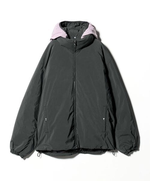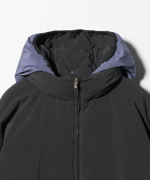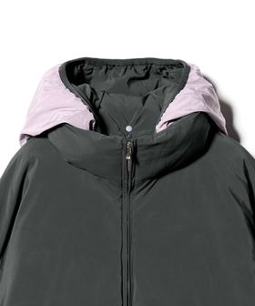 着脱可能なフードは裏返しで取り付けて配色にすることも可能で、コーディネートのアクセントとしても活躍します。