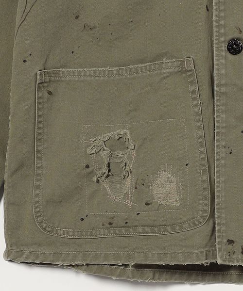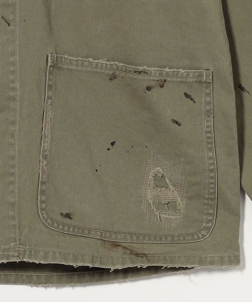 生地にとどまらず、ブランドならではのディテールや、使い古されたことによる破れリペアなど、独自のこだわりが光る一着です。