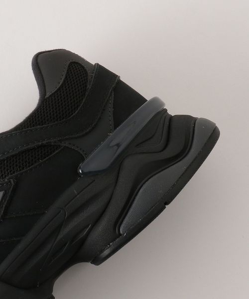ブラックを基調とするワントーンで統一しつつ、複数の素材でレイヤードすることで奥行きのあるデザインに仕上げられた一足です。