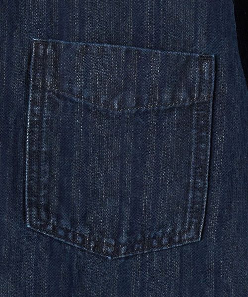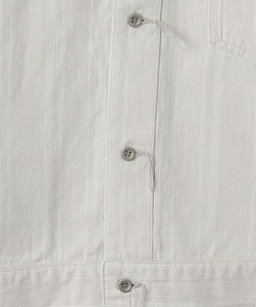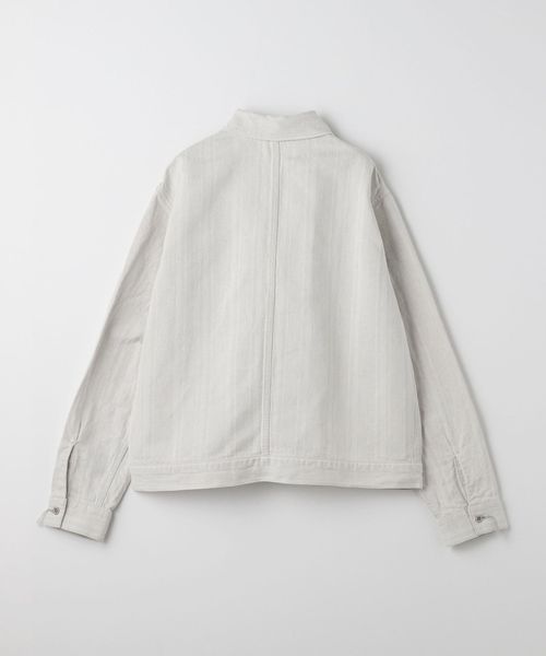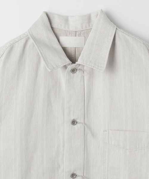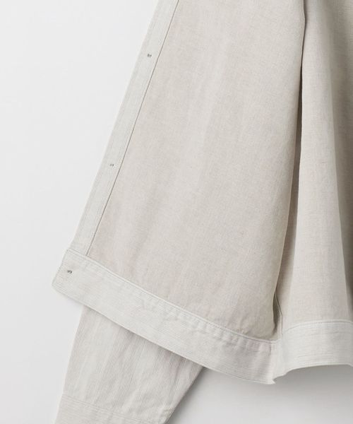 スリランカの民族衣装にインスパイアされた、コットン/麻のストライプデニムによるトラッカーシャツジャケット。