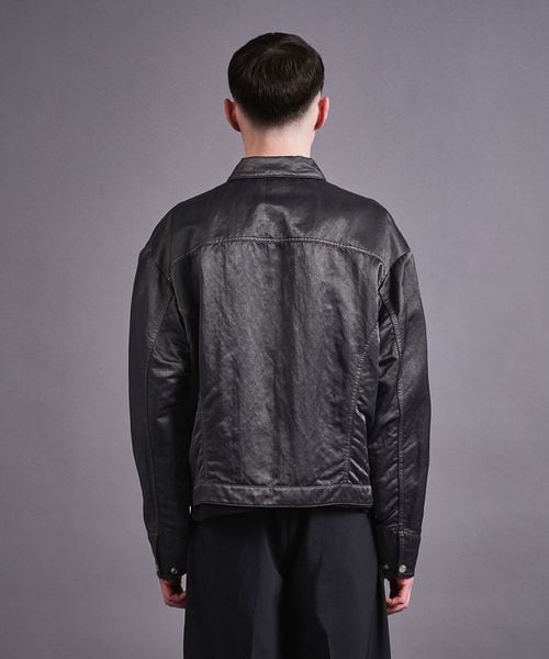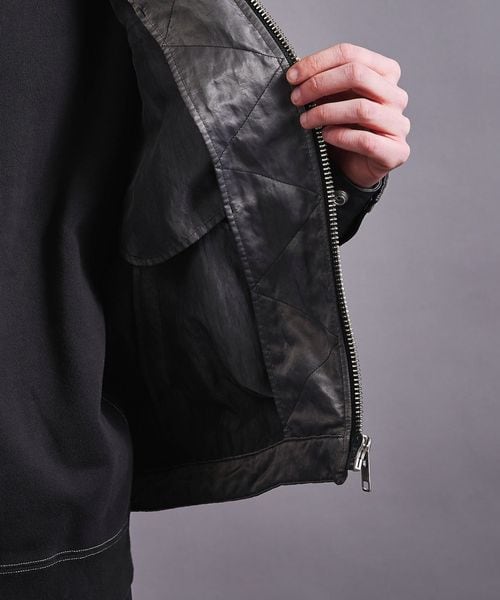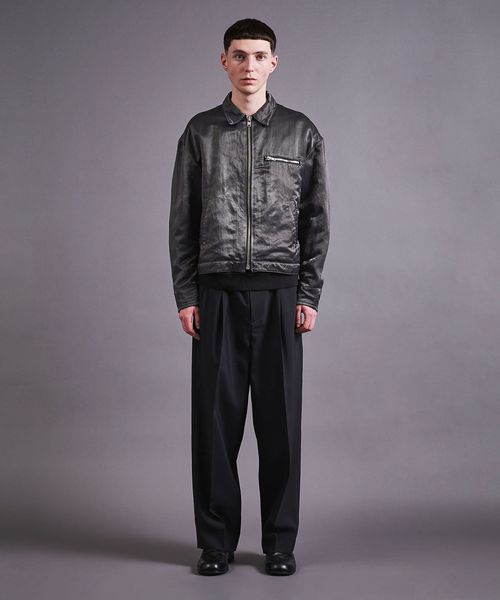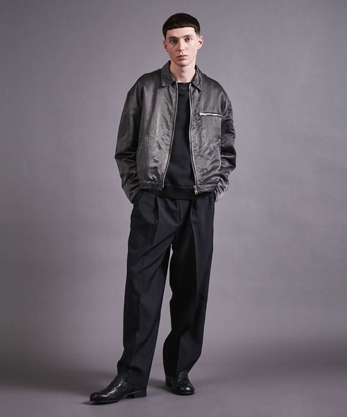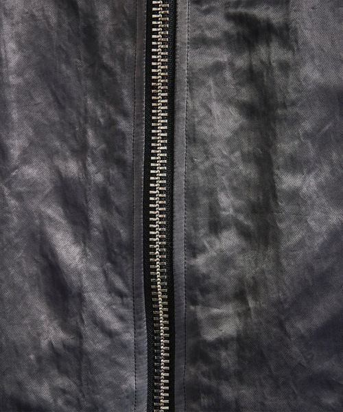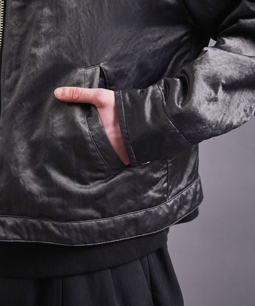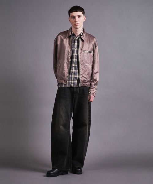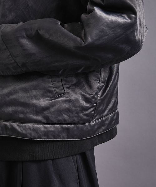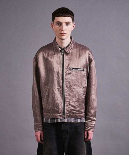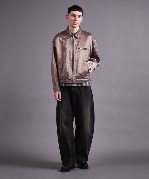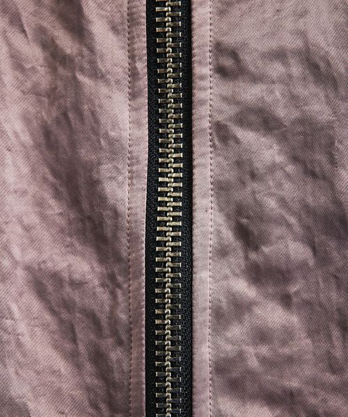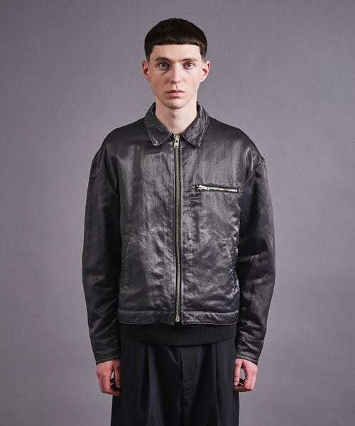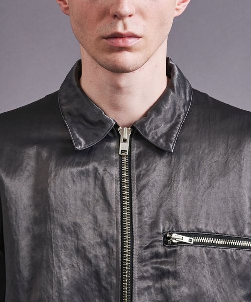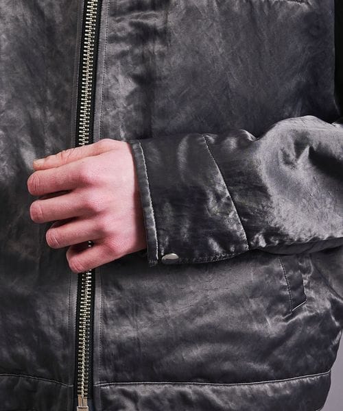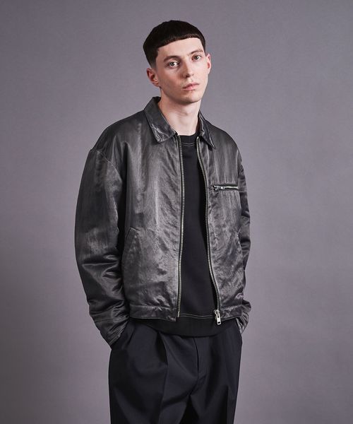 サテン特有の光沢感を製品染めを施すことで鈍い光沢に仕上げたジップジャケット。