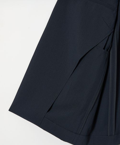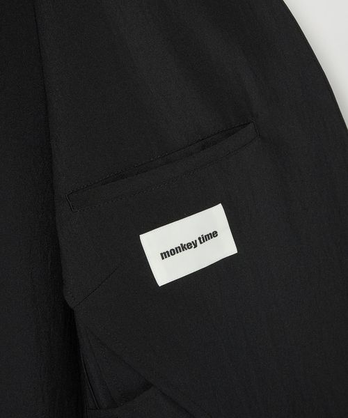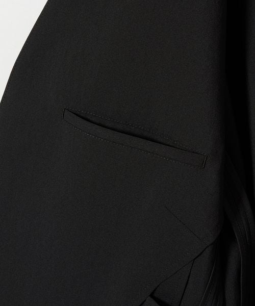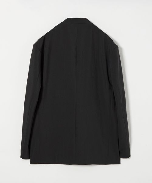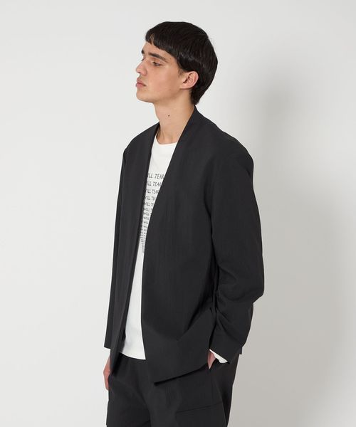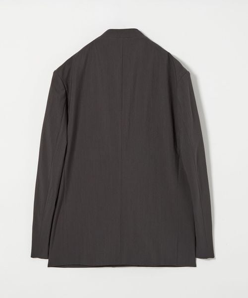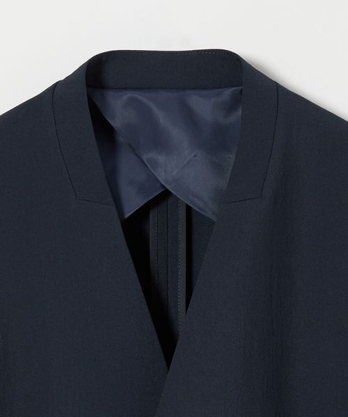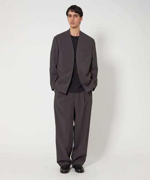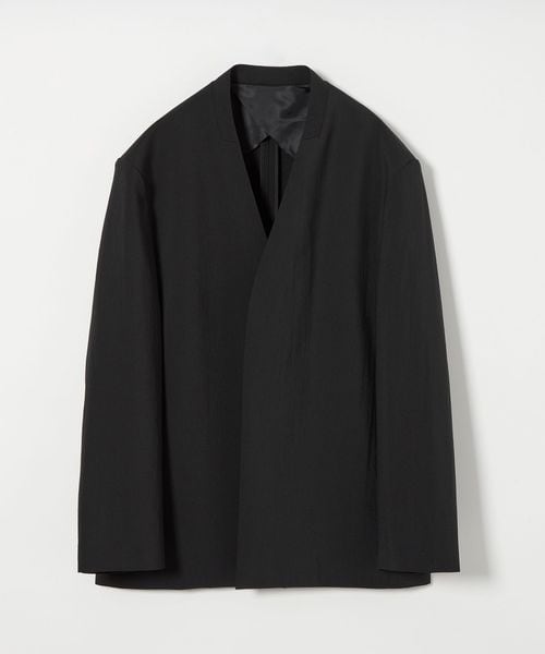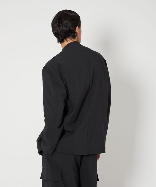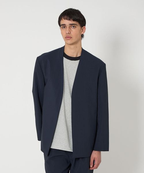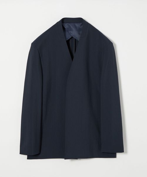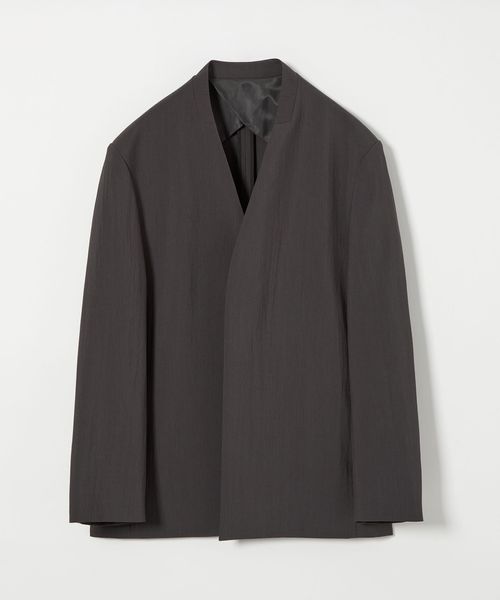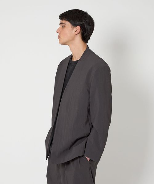 ウールライクなキレイ目の素材感ながらも麻のような肌離れの良さが特徴のラペルレスジャケット。