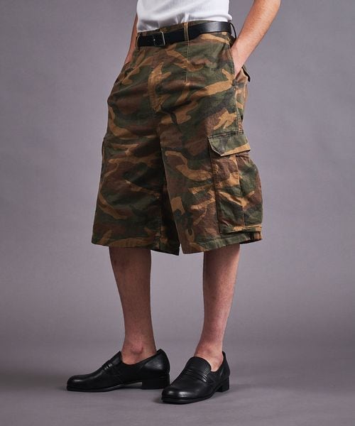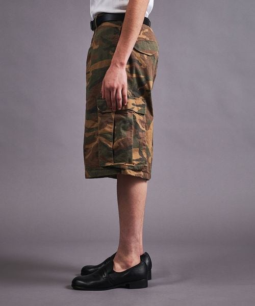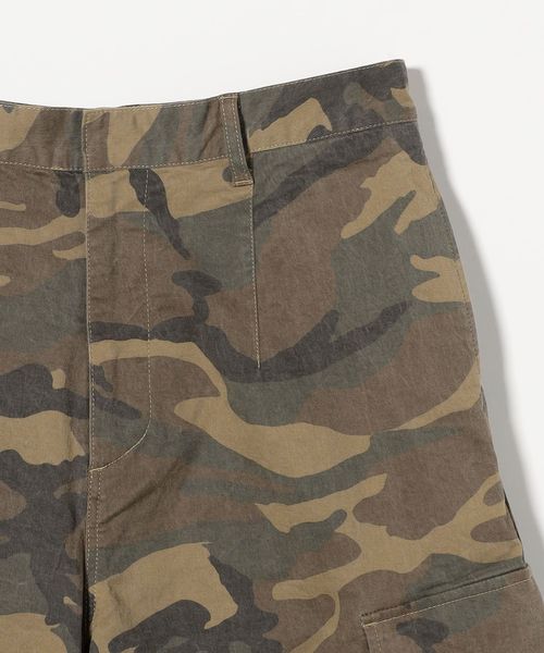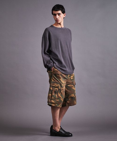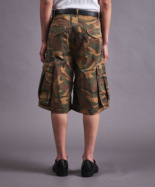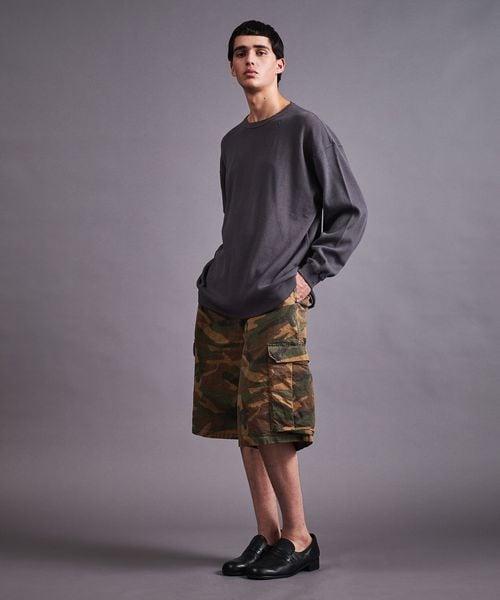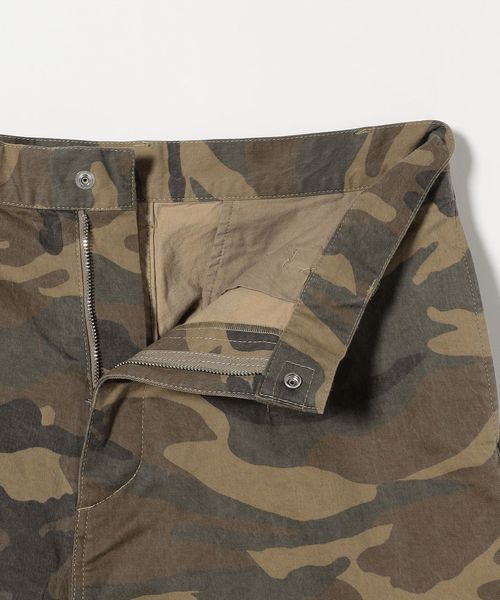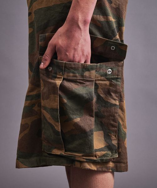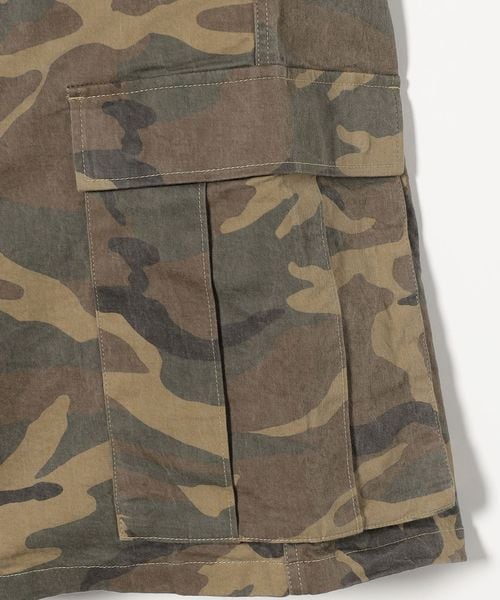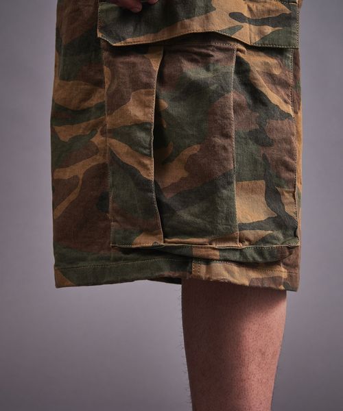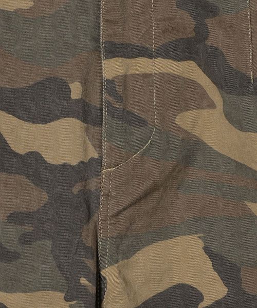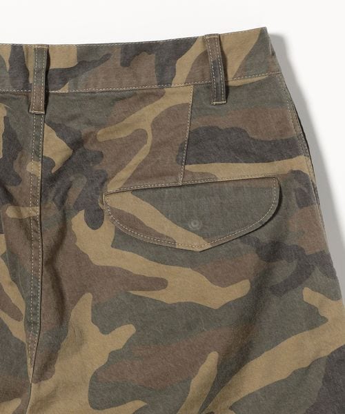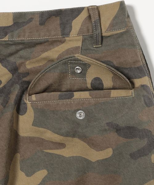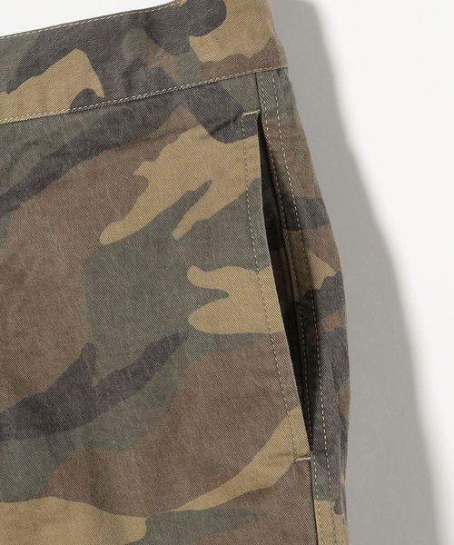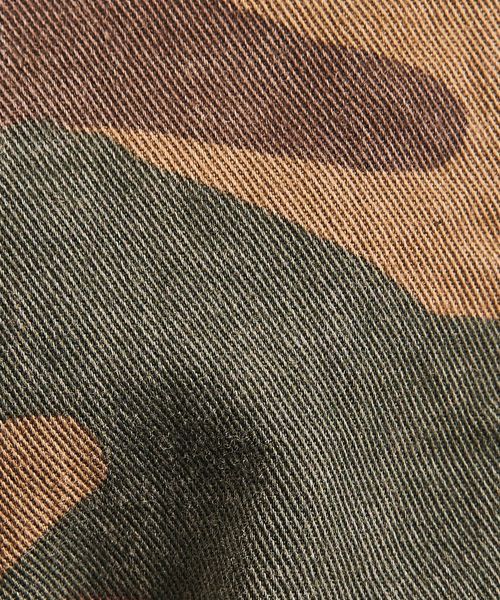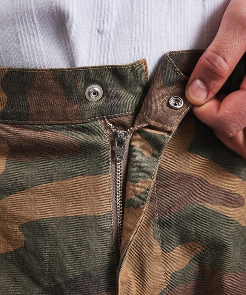 ツイル素材にウッドランドカモをプリントした生地の状態で一度洗い、最終製品の状態でも洗って褪せたカラーリングに仕上げたこだわりのアイテムです。
