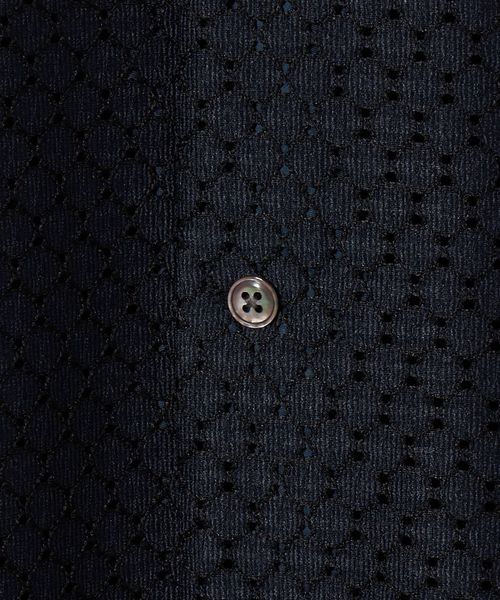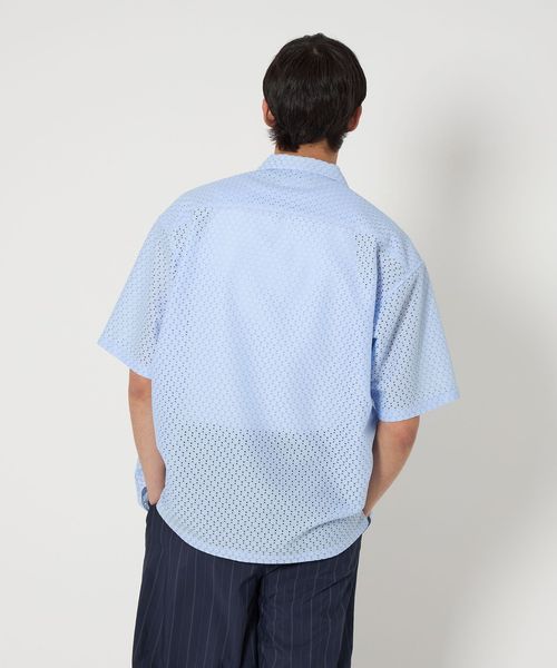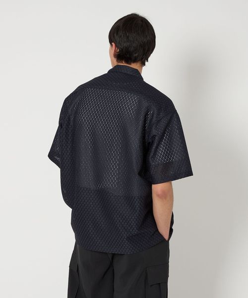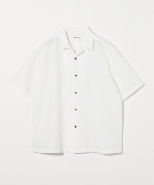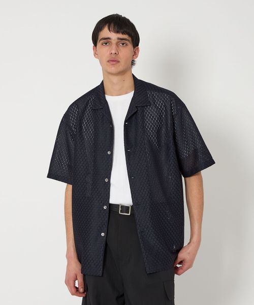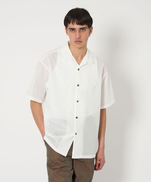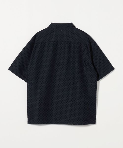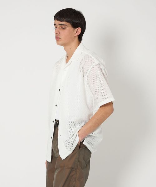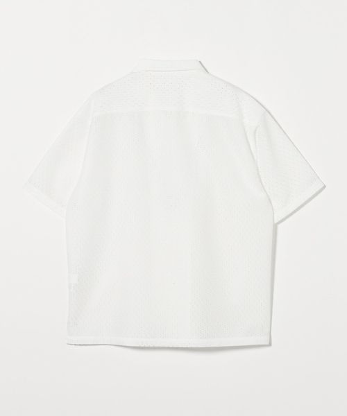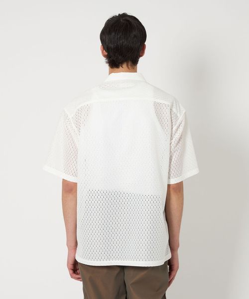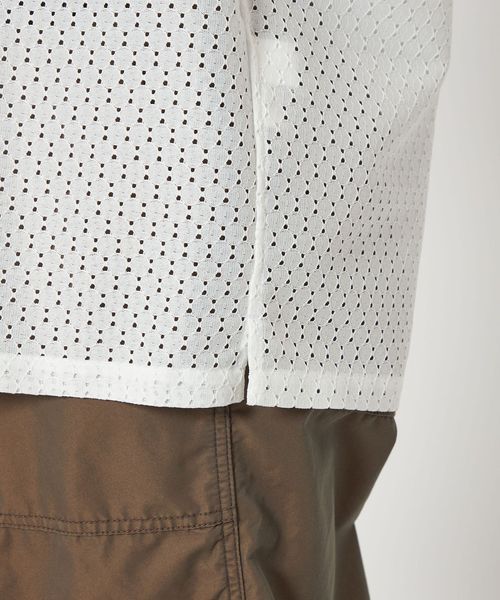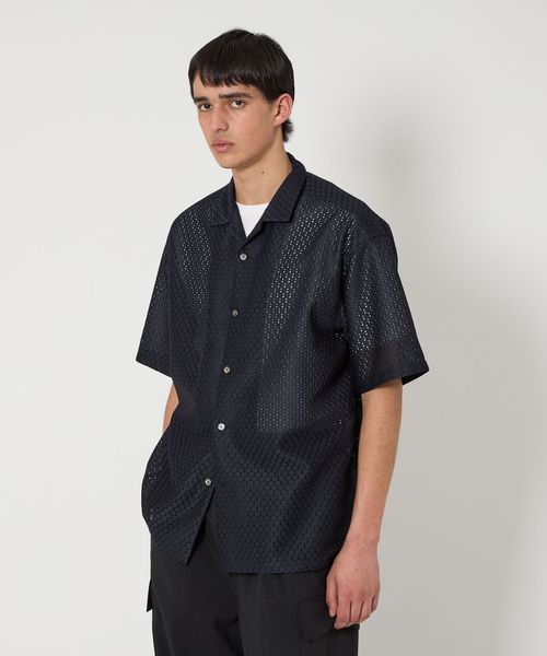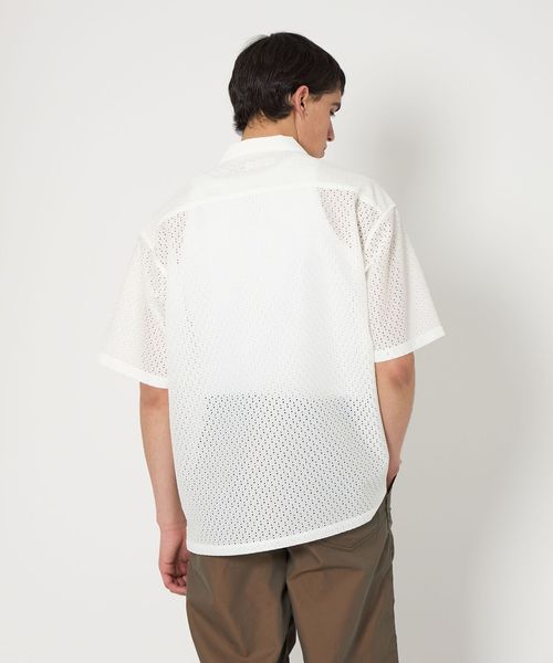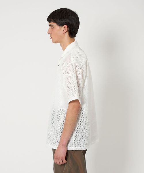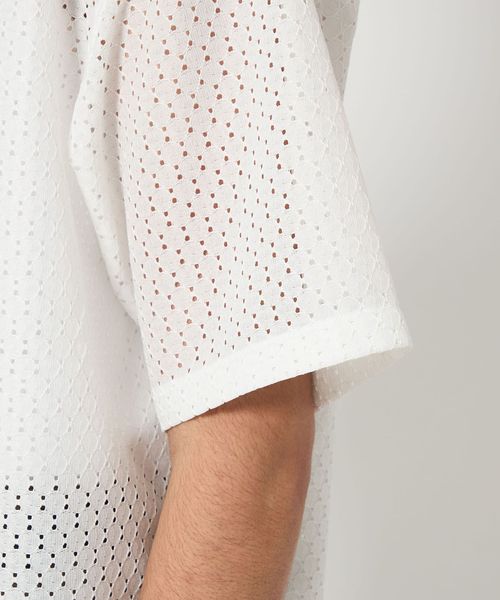 肌離れと清涼感のあるアイレット組織のラッセル素材を使用したオープンカラーシャツ。