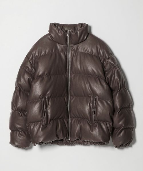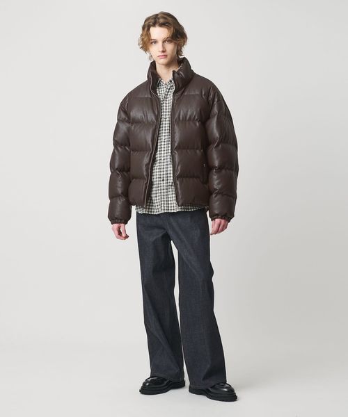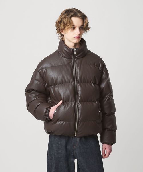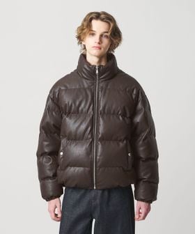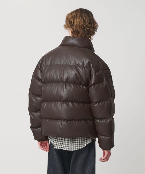 表生地に合成皮革を使用した立ち襟のダウンジャケット。