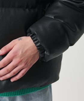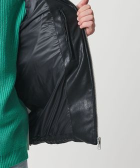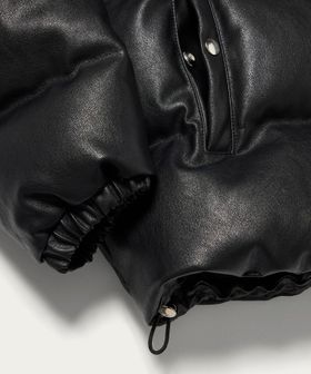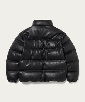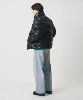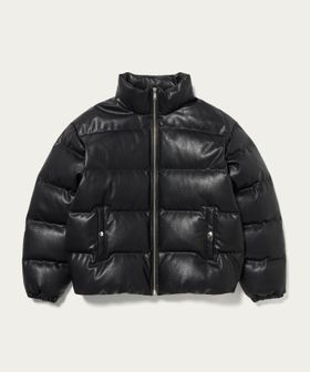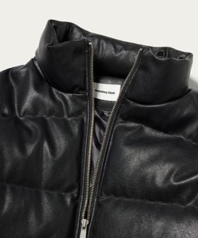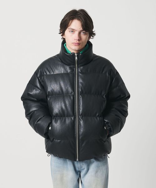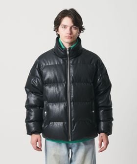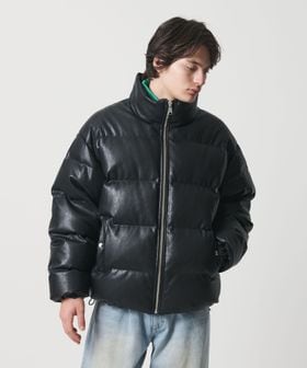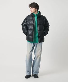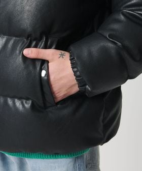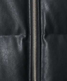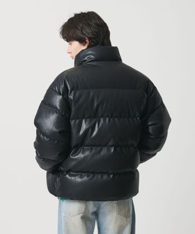 表生地に合成皮革を使用した立ち襟のダウンジャケット。