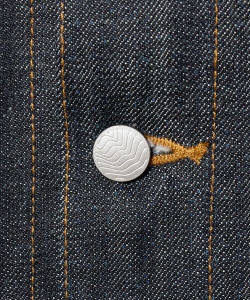 タック釦やリベットにはレーザー彫刻によるオリジナルパターンを施しています。