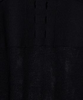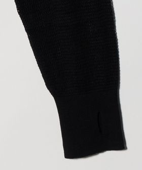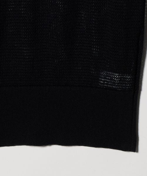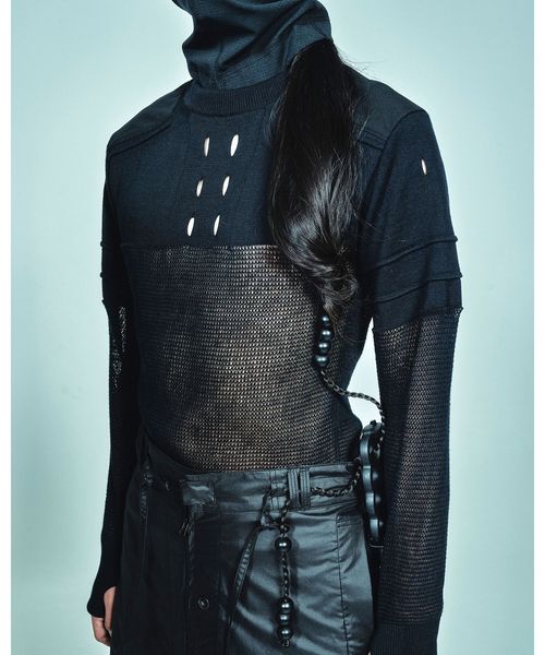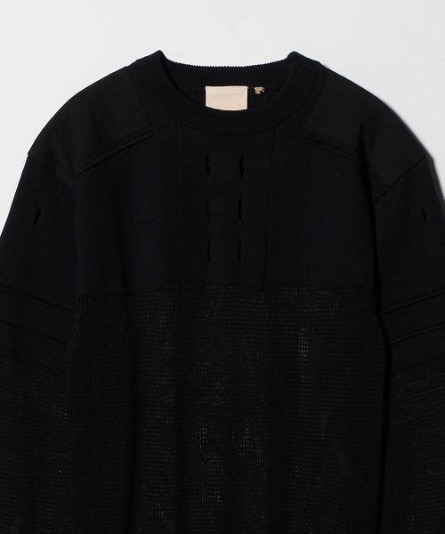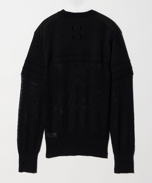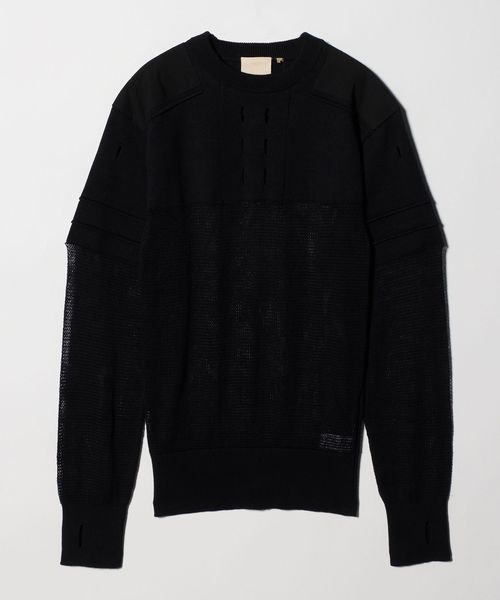 随所に配置したオーバル状のホールと、透け感のあるメッシュニットの切り替えが特徴的なクルーニット。