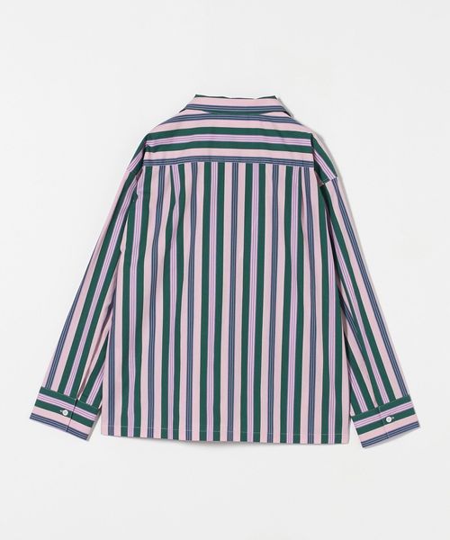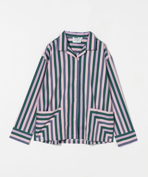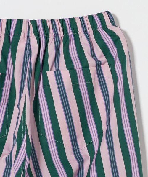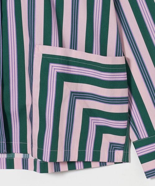 トップスの襟や袖、袖口のストライプパターンが正確に繋がるように精密に裁断され、ポイントになるシンプルなポケットは、ストライプパターンとコントラストをなすように、一列一列を合わせて縫製する、こだわりの方法で仕上げられています。