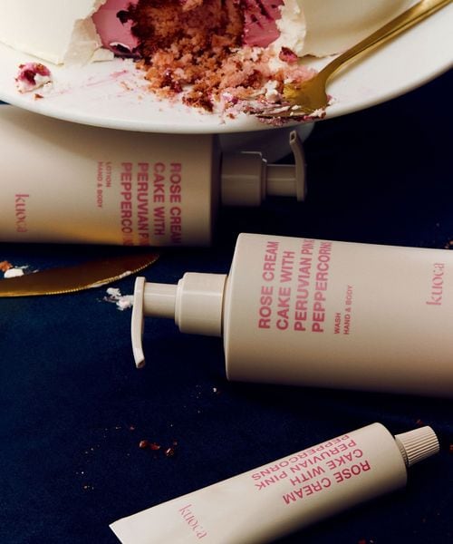 ピンクペッパーを載せた「ROSE CREAM CAKE(ローズクリームケーキ)」の香りのハンドクリーム。