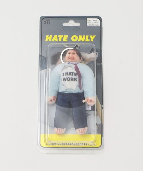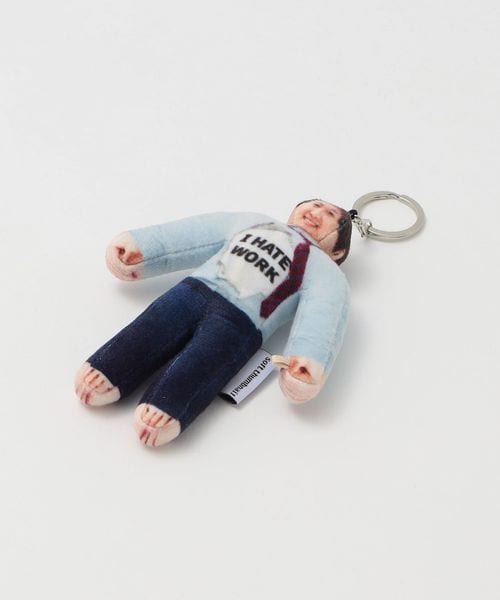 “I HATE WORK” の服を着た記者の“ヨシヒロ”をモチーフにしたぬいぐるみキーホルダー。