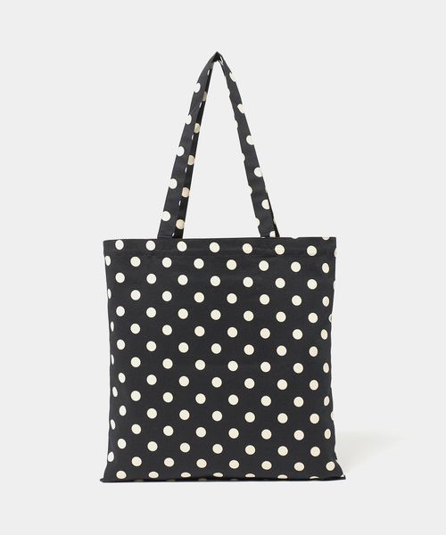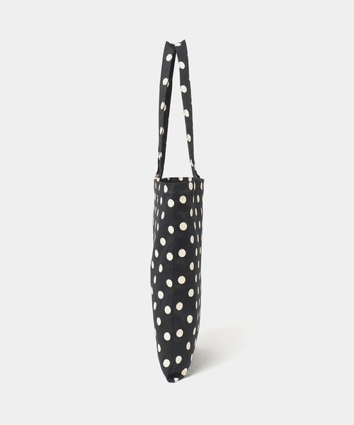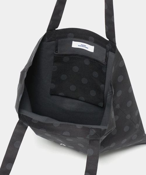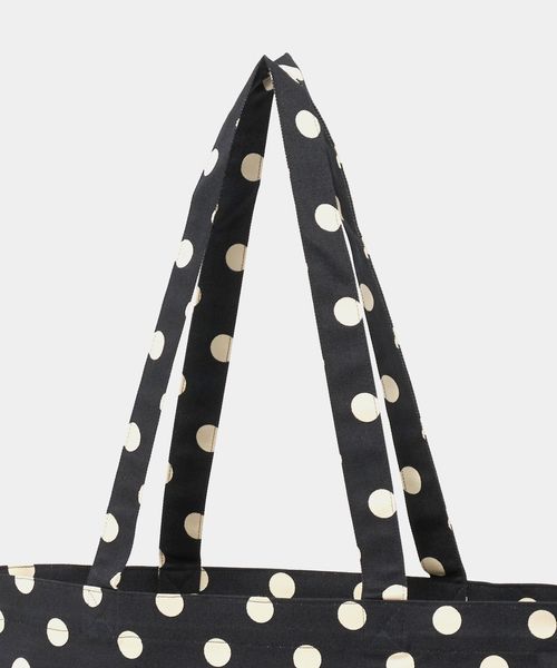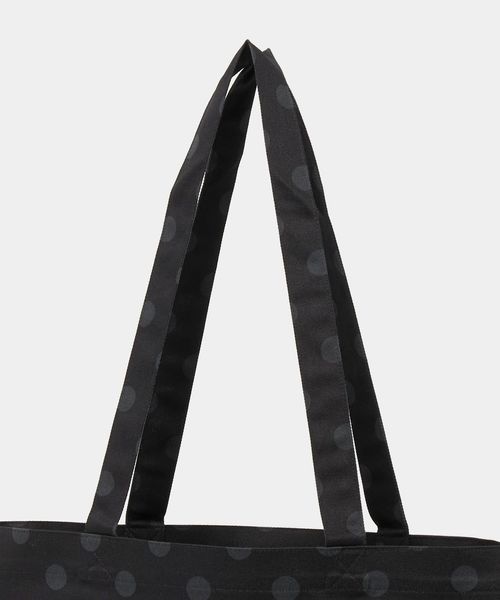 シックなカラーリングのドット柄生地を使用し、フロントにシグネチャーロゴグラフィックをプリントしたトートバッグ。