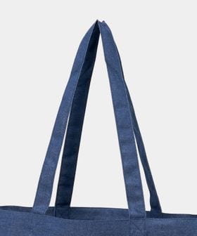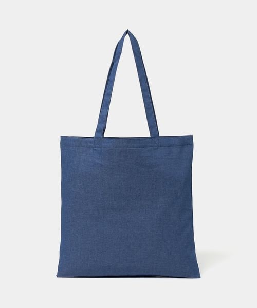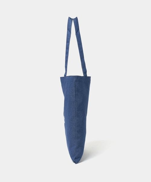 デニム生地を使用し、フロントにシグネチャーロゴグラフィックをプリントしたトートバッグ。