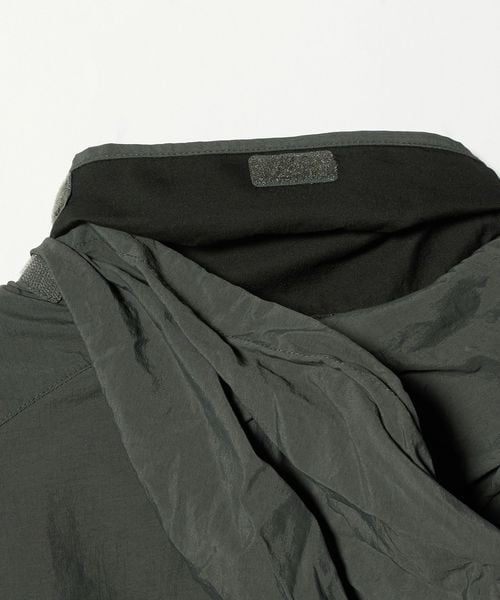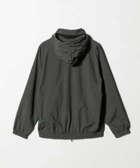 襟にフードが収納されており、ランニングなど野外での急な小雨などにも対応可。
