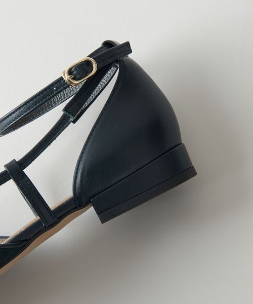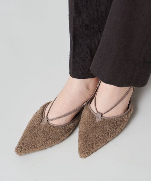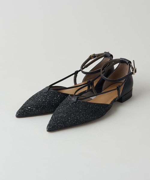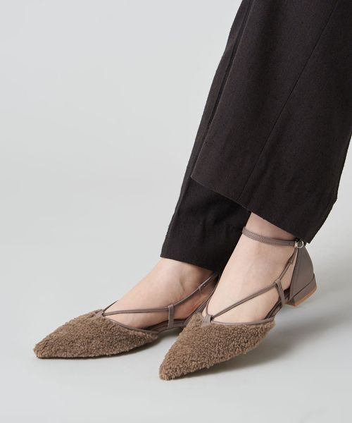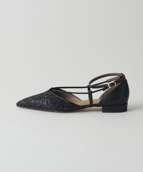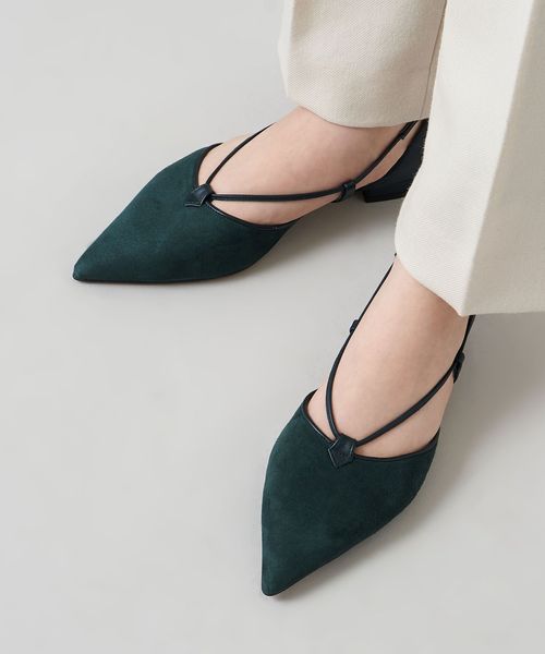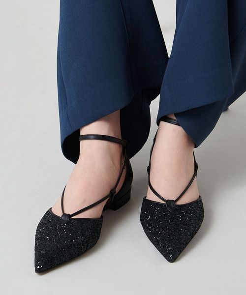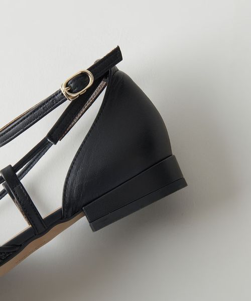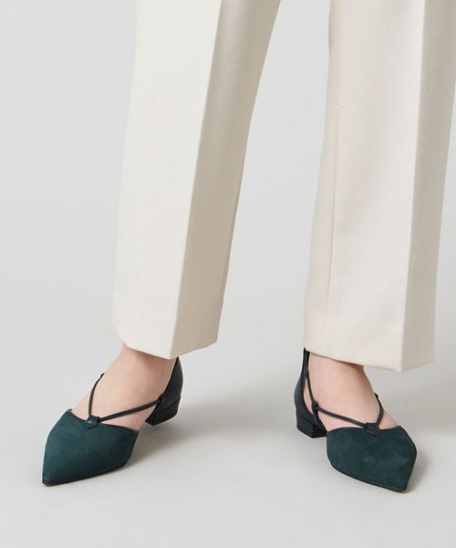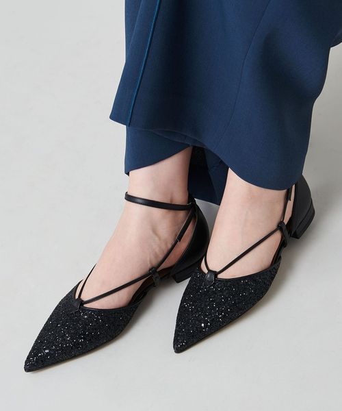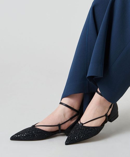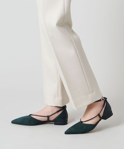 サイドに抜け感があり、女性らしさを演出します。アンクルストラップ付きで足が抜ける心配がなく、ホールド感のある履き心地も魅力的。フラットシューズでもポインテッドのつま先でシャープな印象をプラスし、甲にかかる細い革ひもが足をすっきりと見せてくれます。