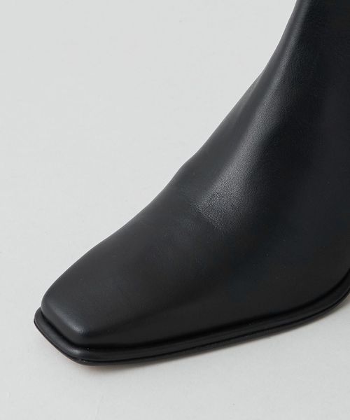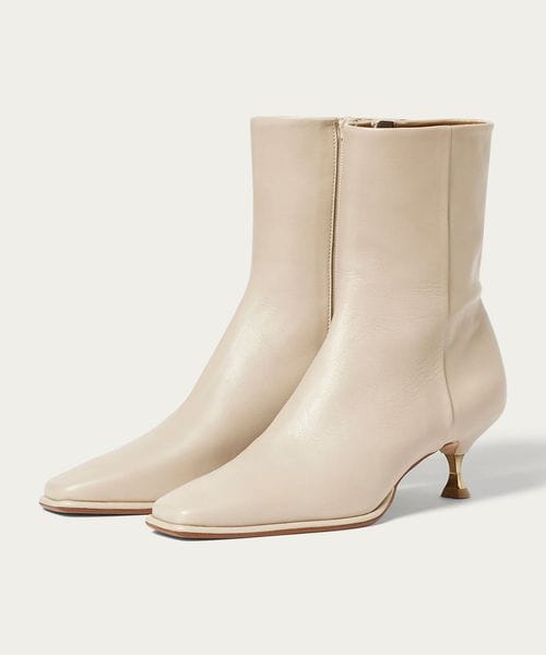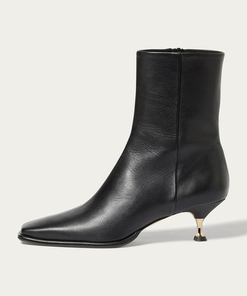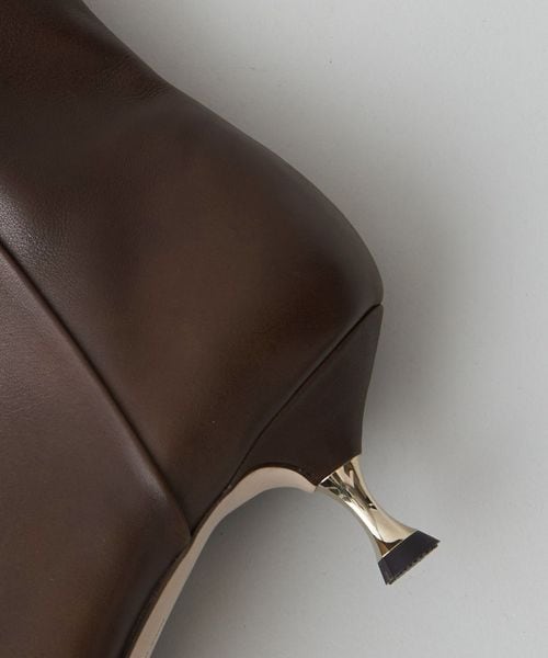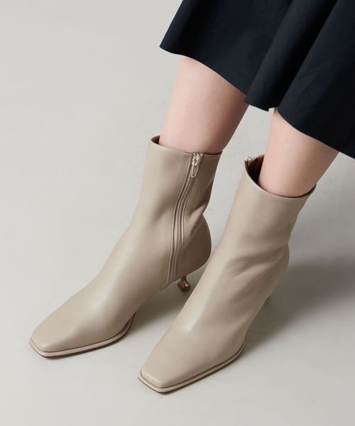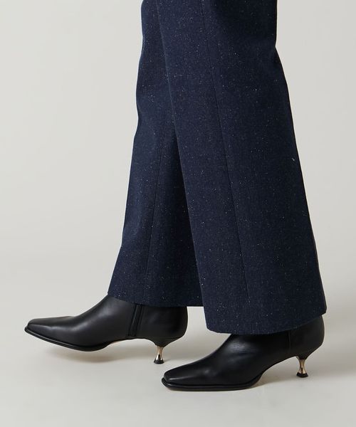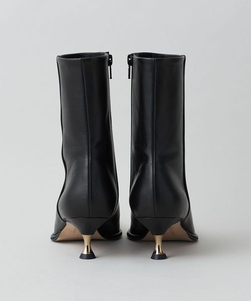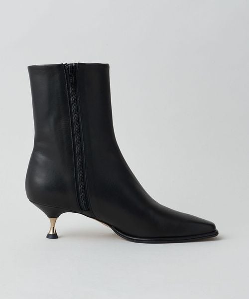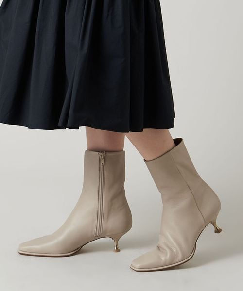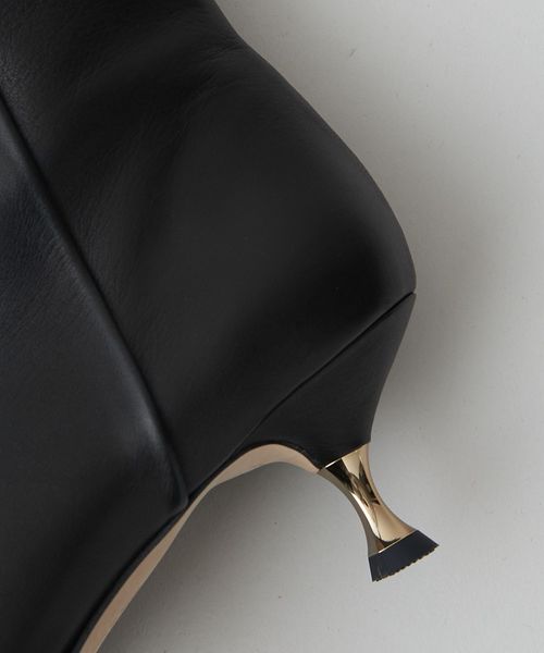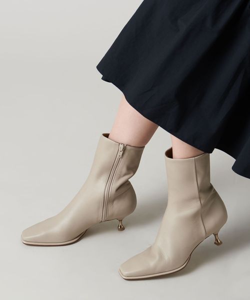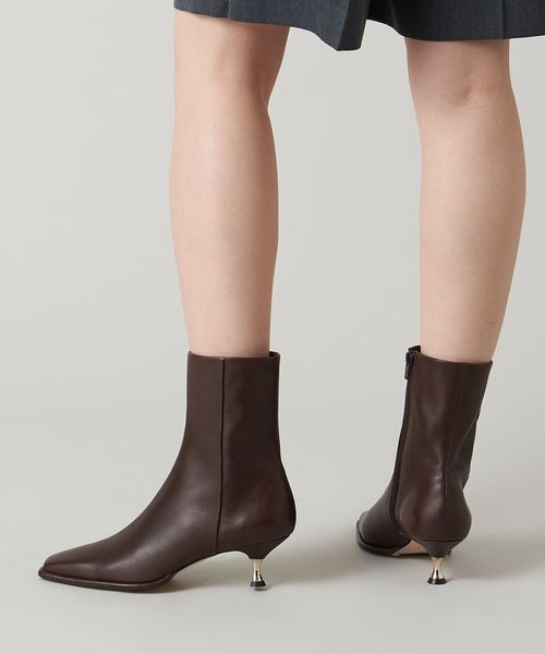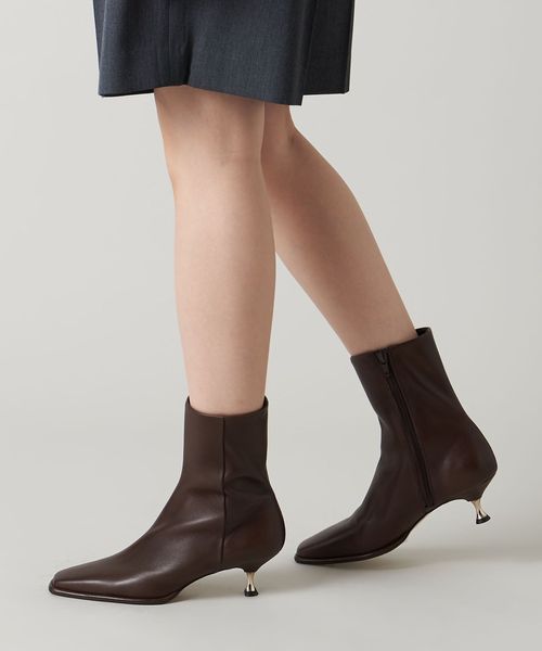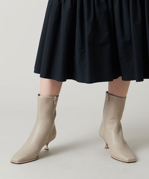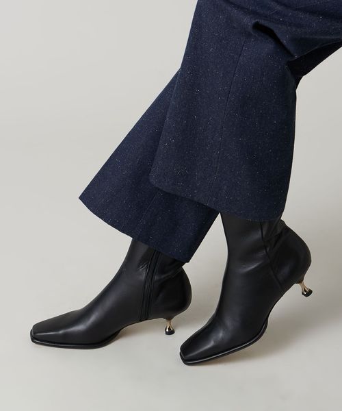 さりげなく輝くメタルヒールはバックスタイルにもアクセントをプラス。地面に向かってやや広がり、安定感があるのも魅力的です。ほどよいスクエアトゥと、すっきり脚に沿う筒のシルエットできれいめな印象を漂わせます。