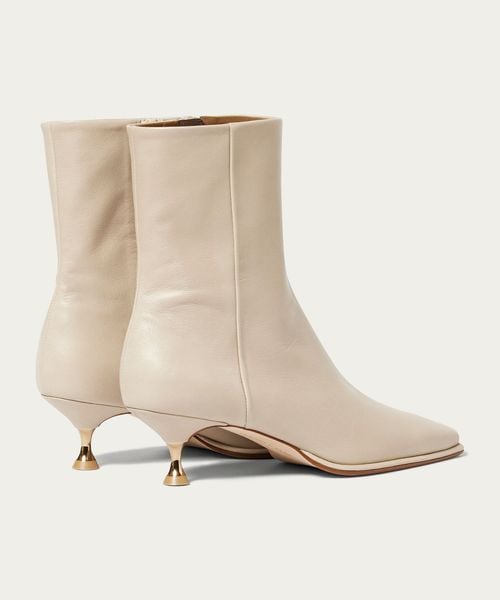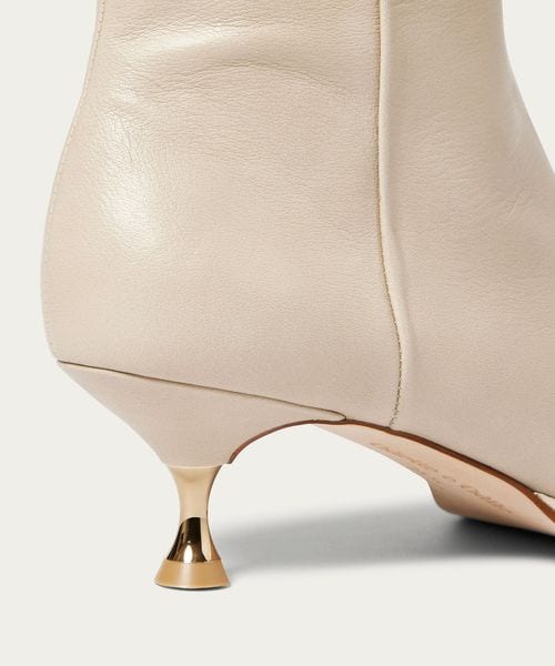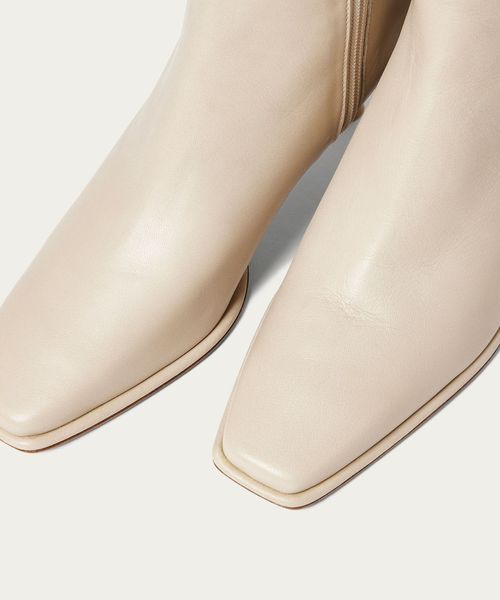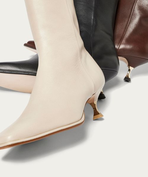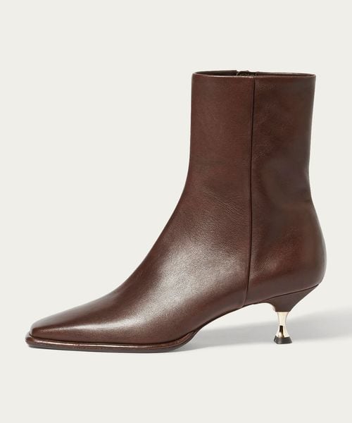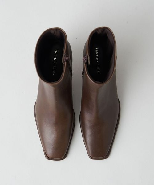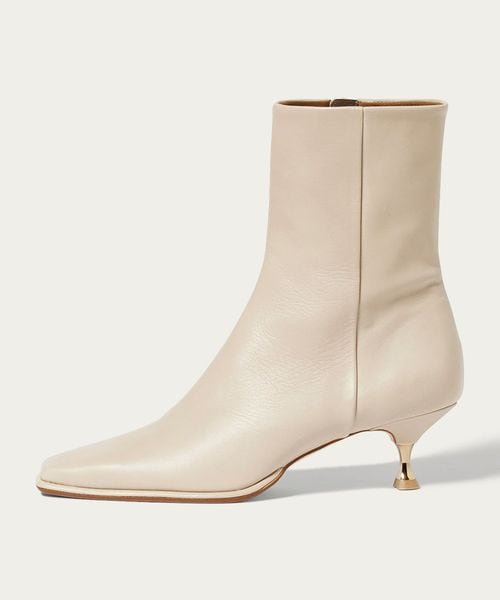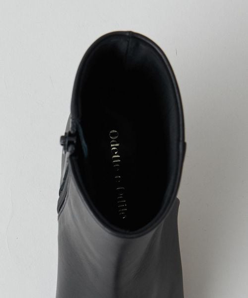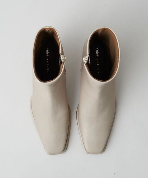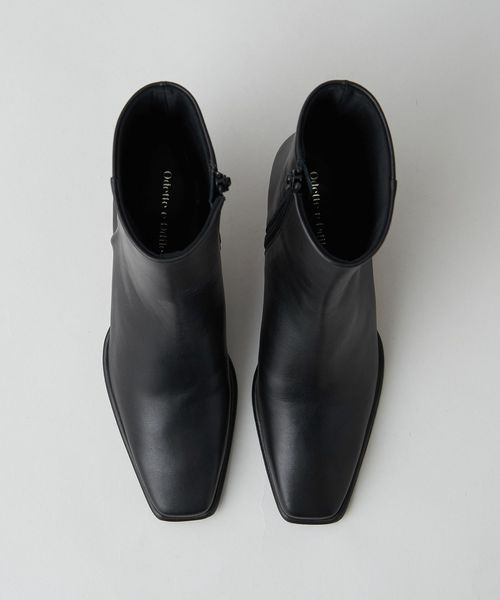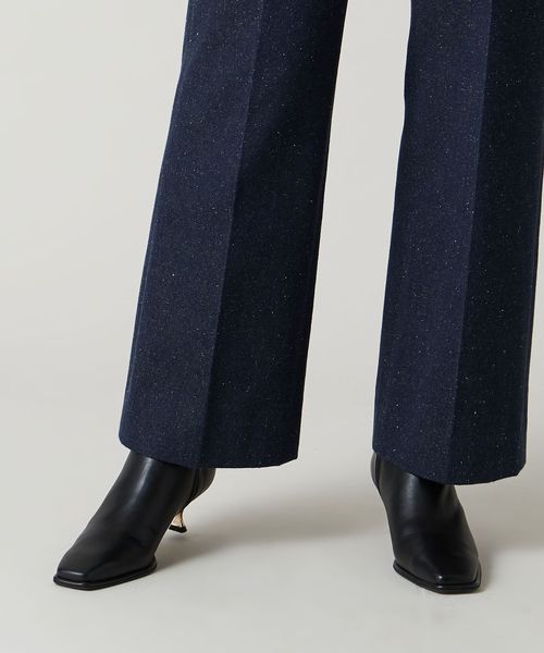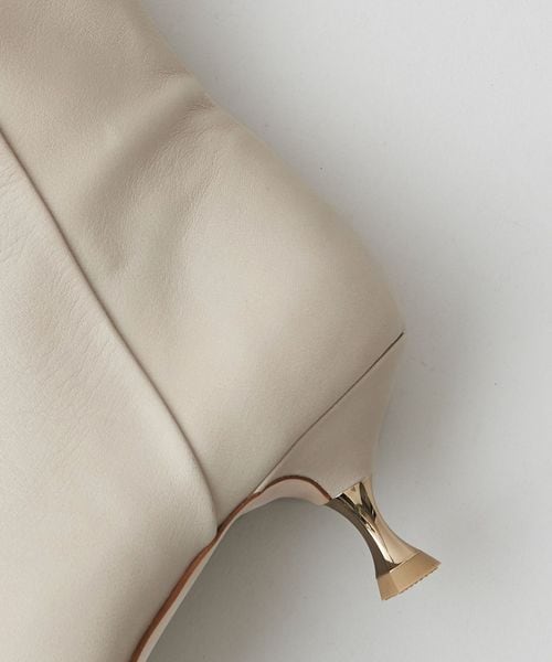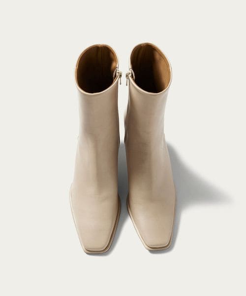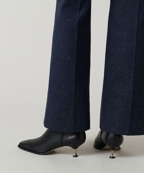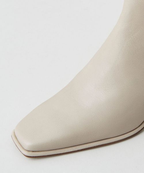 さりげなく輝くメタルヒールはバックスタイルにもアクセントをプラス。地面に向かってやや広がり、安定感があるのも魅力的です。ほどよいスクエアトゥと、すっきり脚に沿う筒のシルエットできれいめな印象を漂わせます。