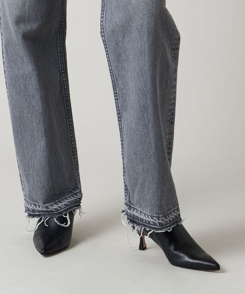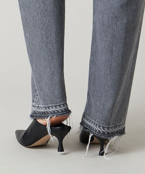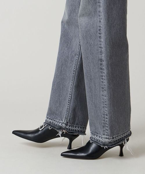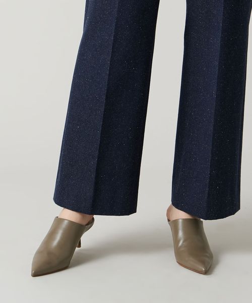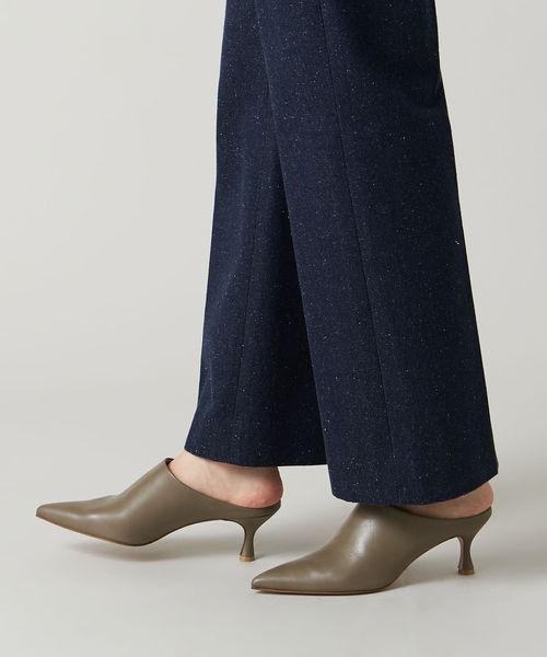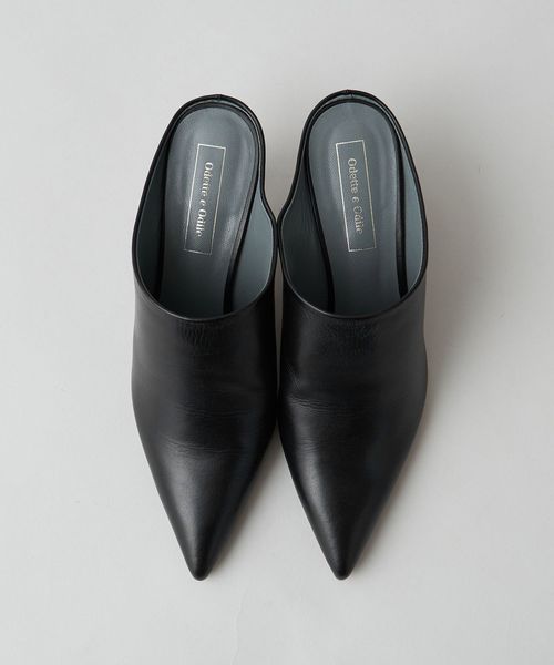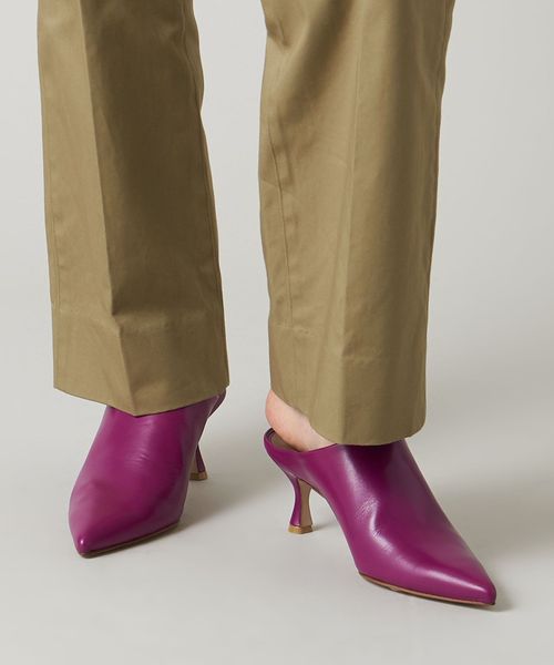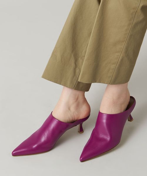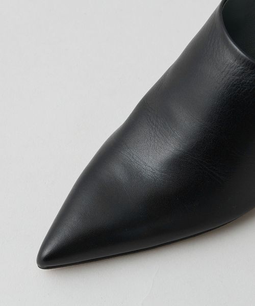 甲まで覆う深めの履き口により、ミュールデザインでも足のおさまりが良く歩きやすいのも嬉しいポイント。シャープなポインテッドトゥがモードで洗練された雰囲気へと導いてくれる一足です。