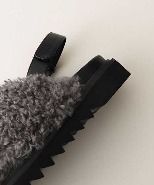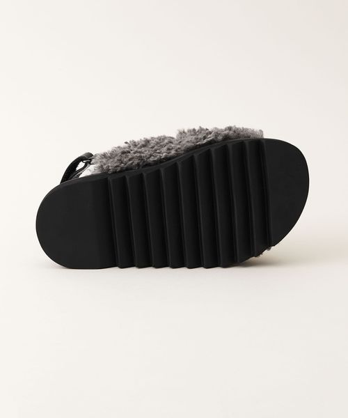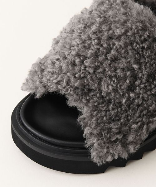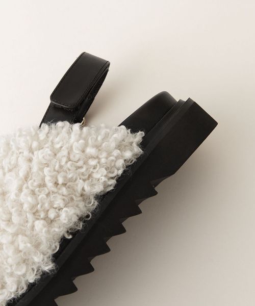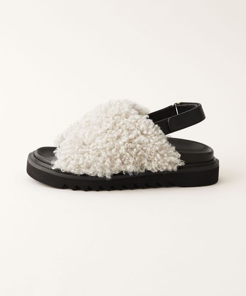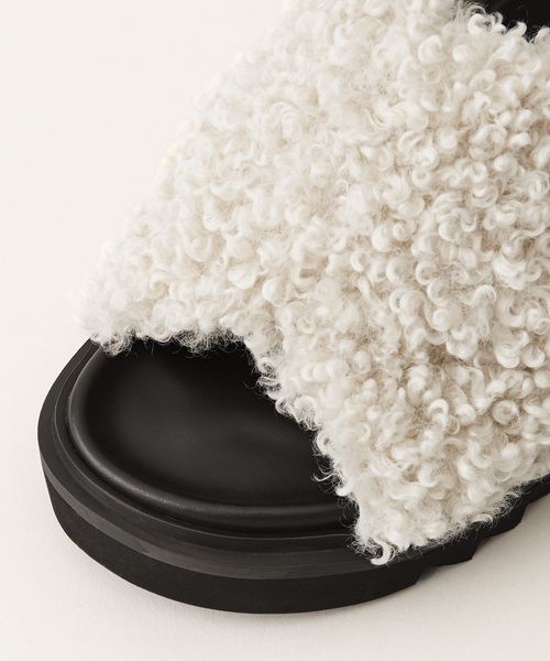 足を覆う太めのクロスベルトとモコモコの素材でボリューミーな足元が完成します。