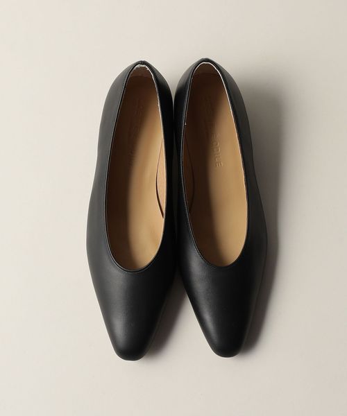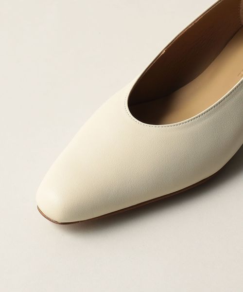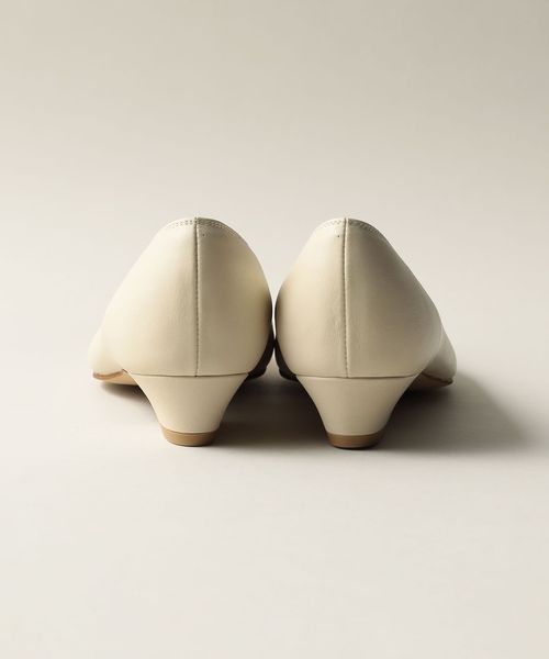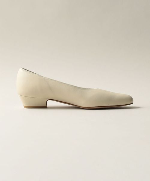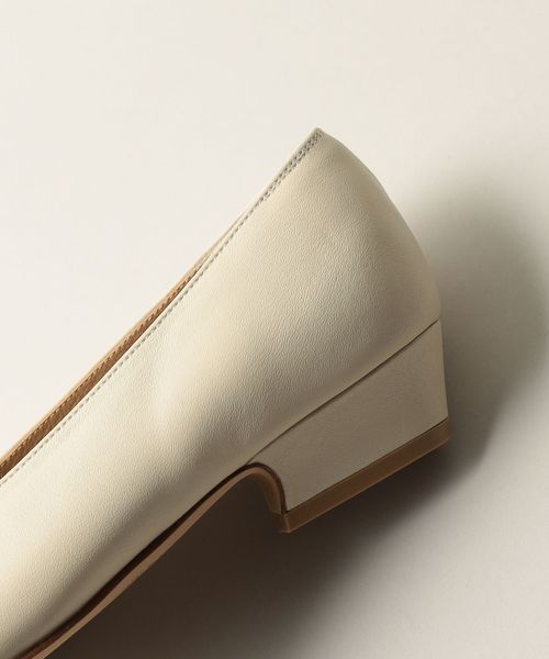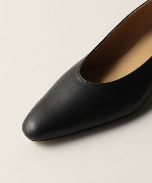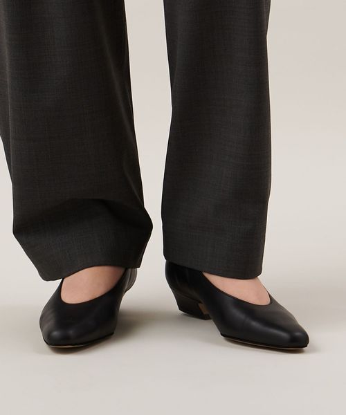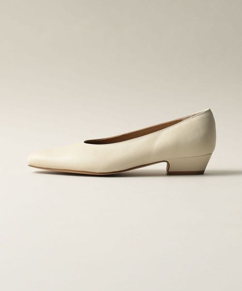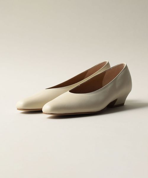 ローヒールのプレーンパンプスは、やや長めのノーズに、足を包み込む深めのカットラインがシックな印象。