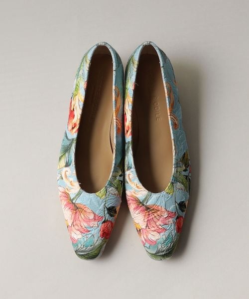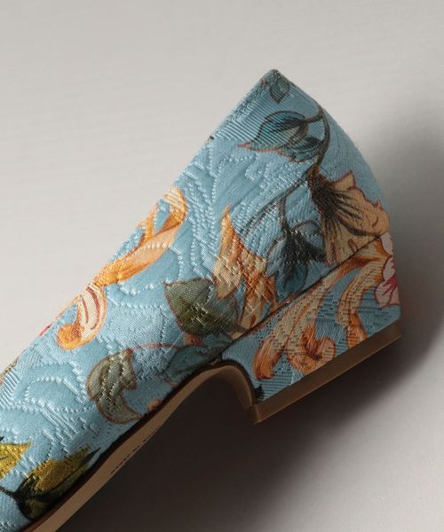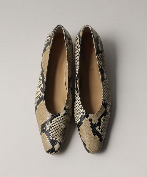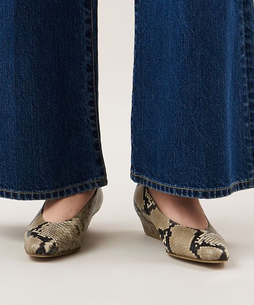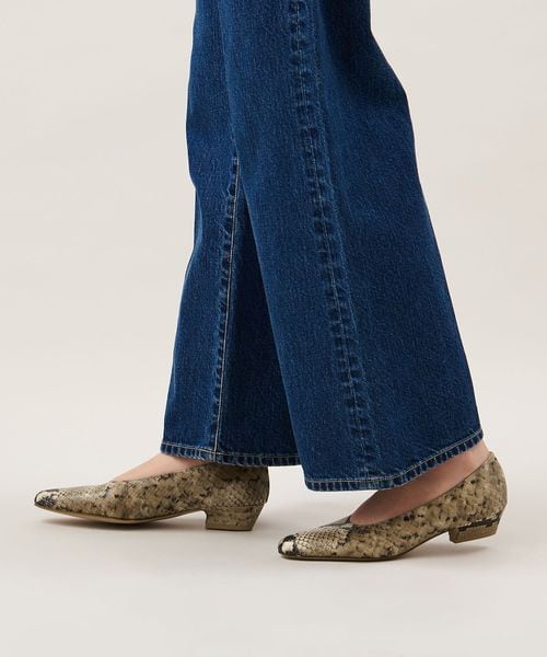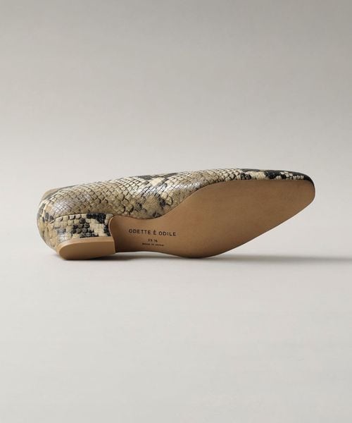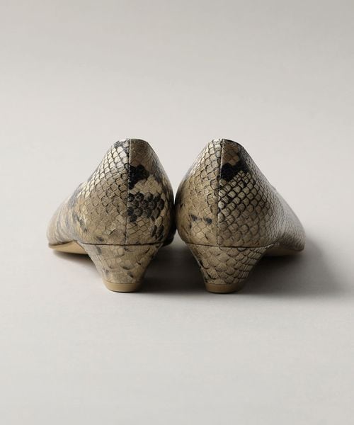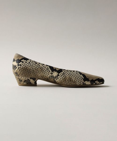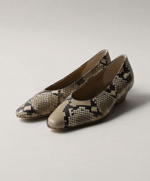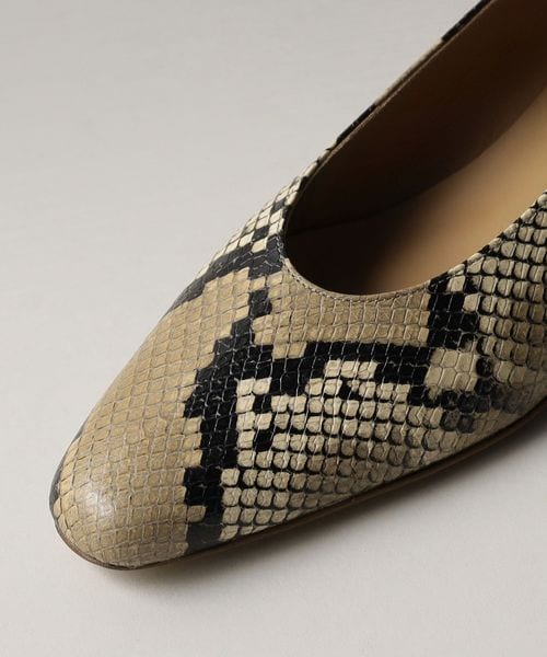 ローヒールのプレーンパンプスは、やや長めのノーズに、足を包み込む深めのカットラインがシックな印象。