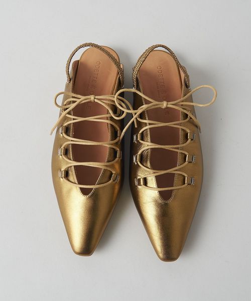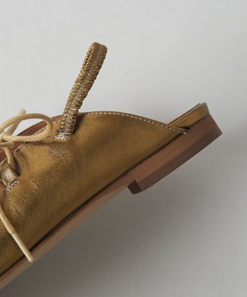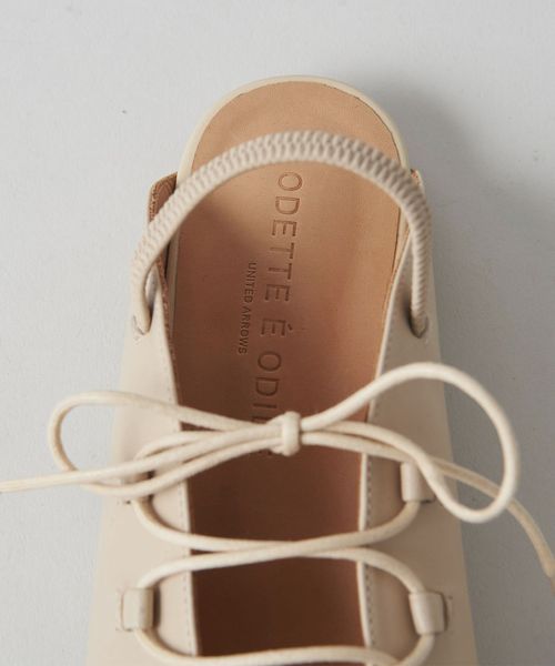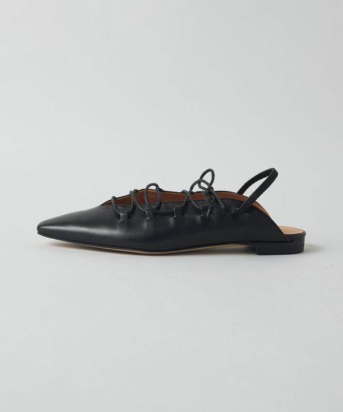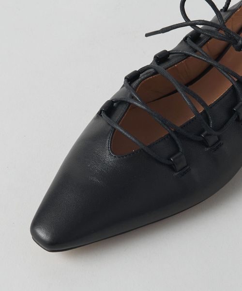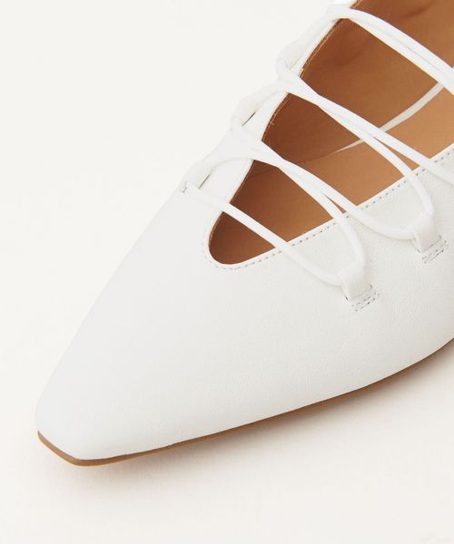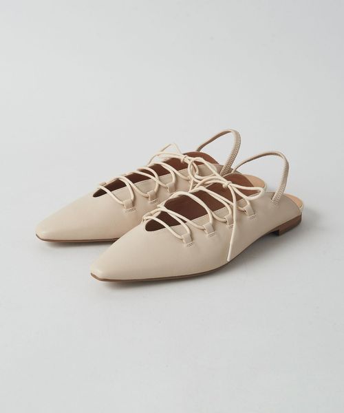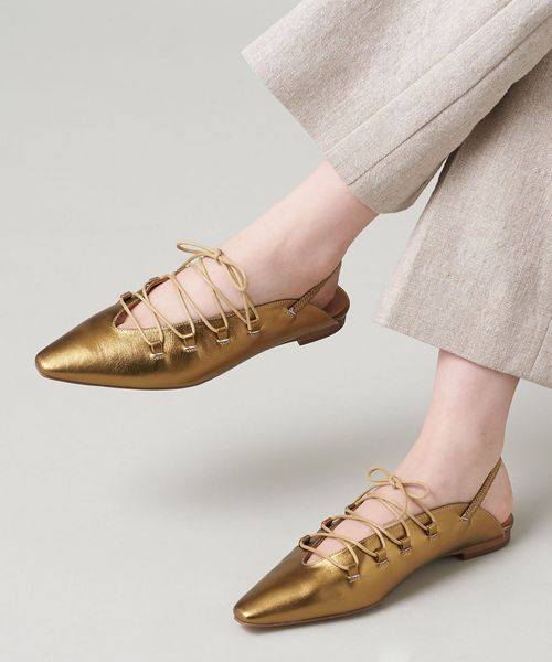 甲全体を紐で編み上げたデザインはかかとの抜け感を控えめにしたスリングバック。