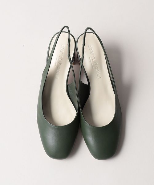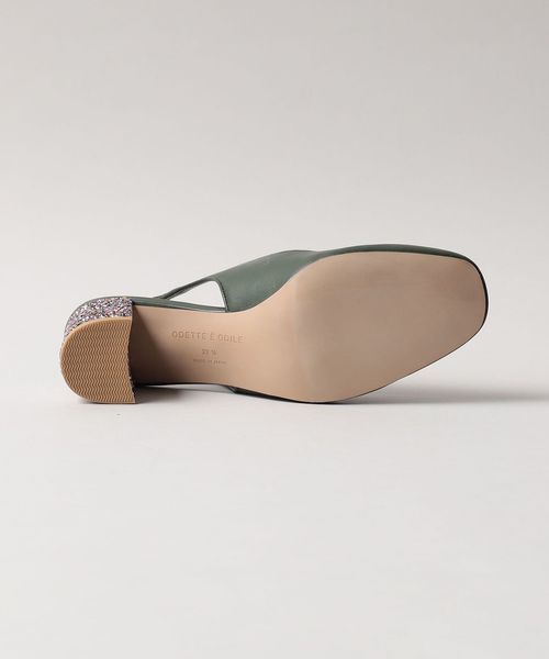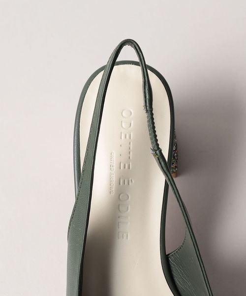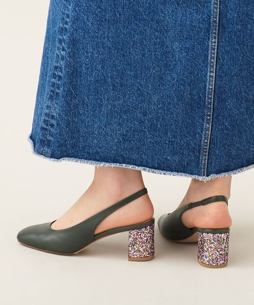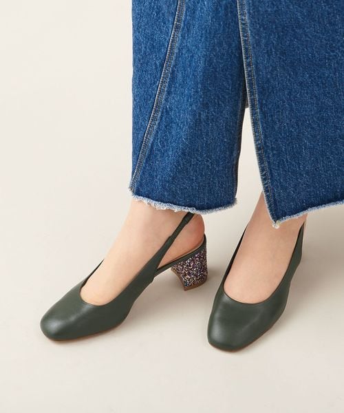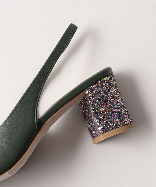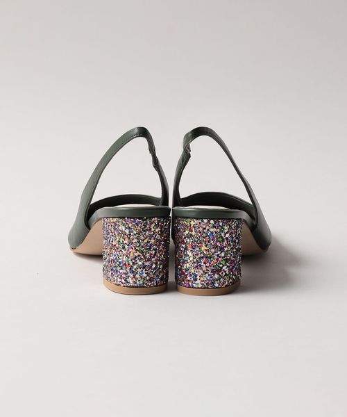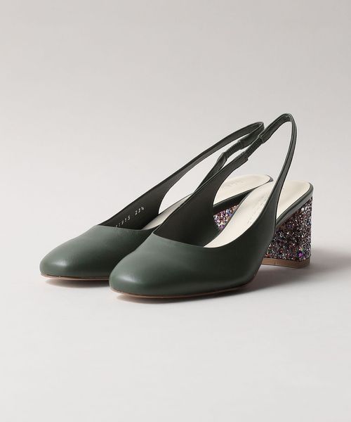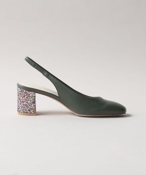 ダークグリーンはアッパーにソフトなスムース素材を使用し、ヒールにはマルチカラーのグリッター素材を巻いて華やかと遊び心をプラスしました。