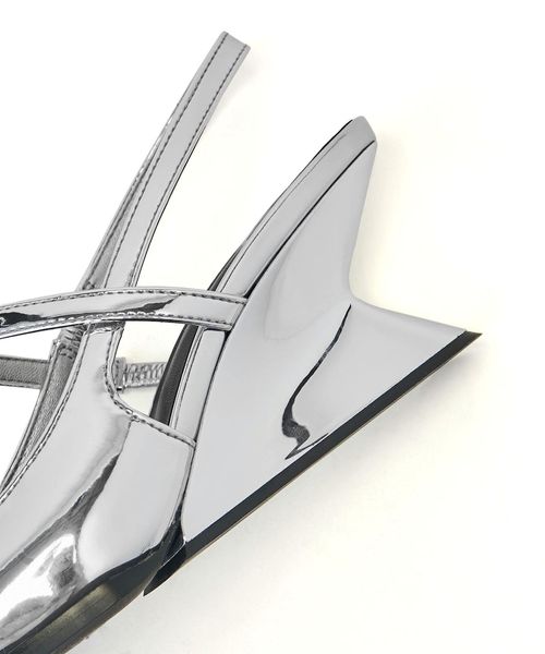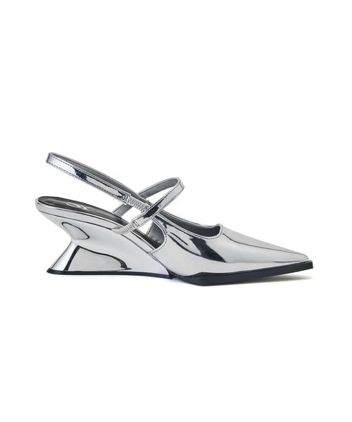 くびれたようなシャープな変形ウェッジヒールと存在感のある角ばった底周りがモード感を演出し、クールな印象の一足。