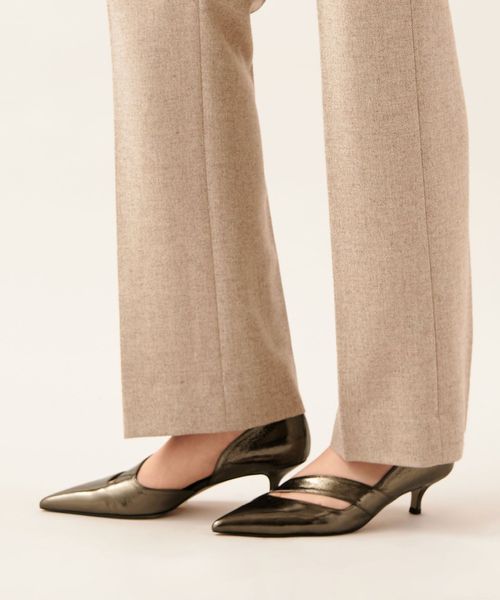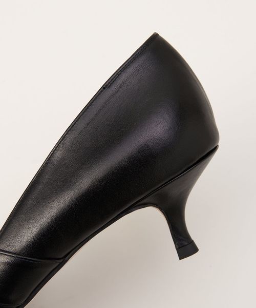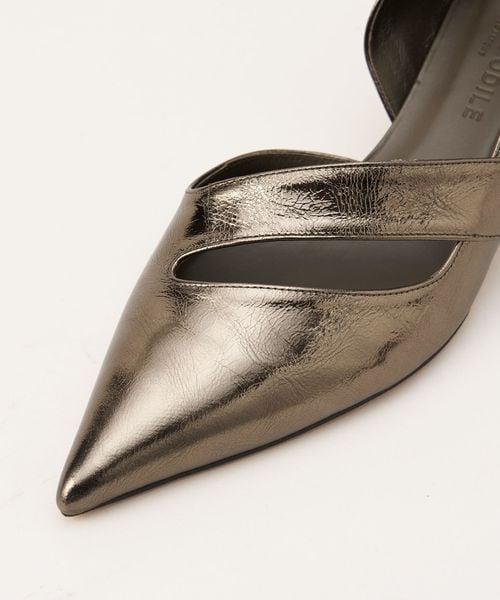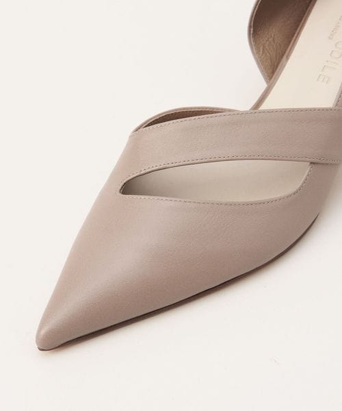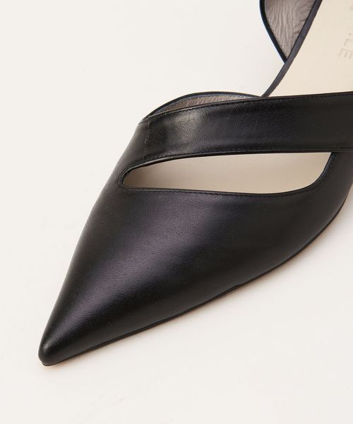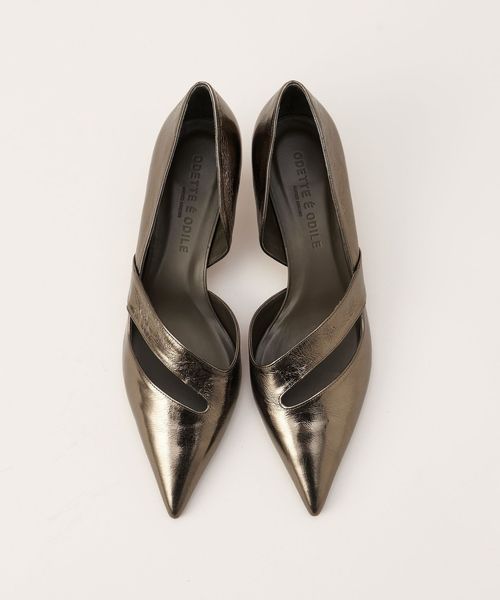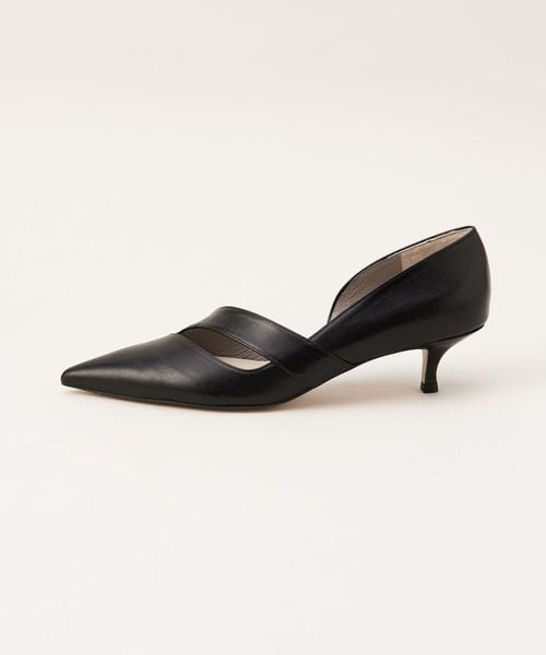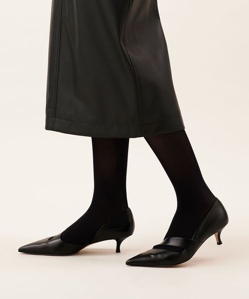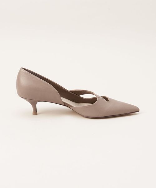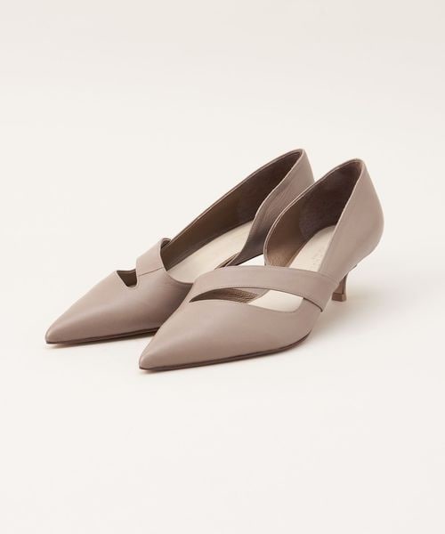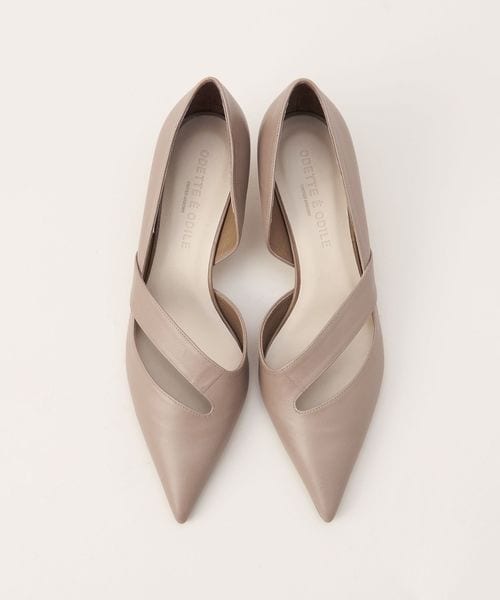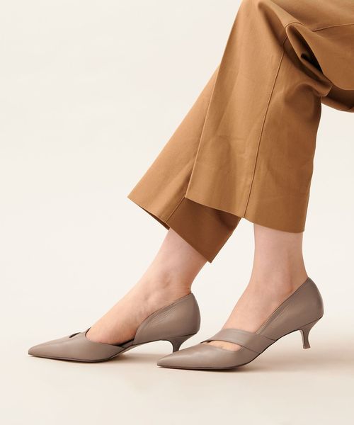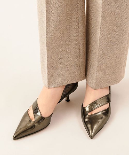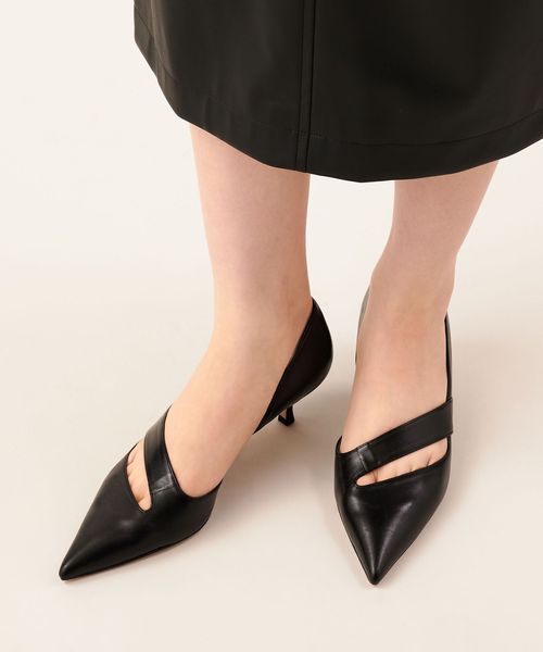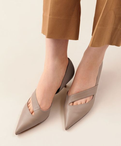 アシンメトリーデザインのパンプスは、バミューダパンツと合わせればトレンド感溢れるスタイルに。