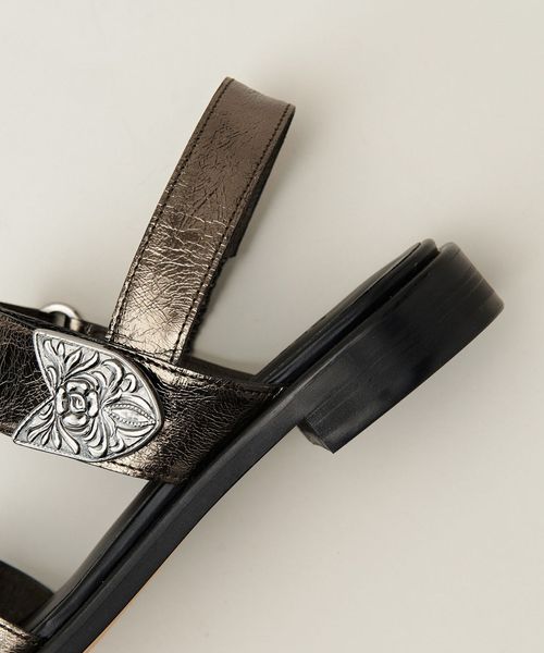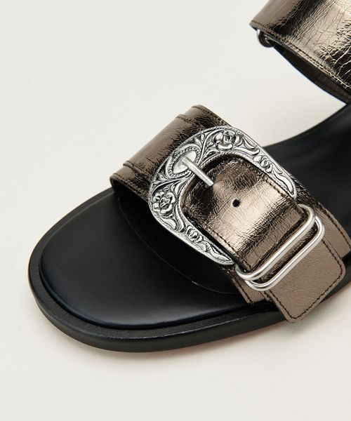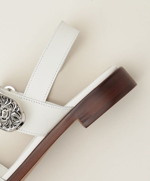 ウェスタンベルトをリメイクしたような個性的なデザインが目をひくサンダル。