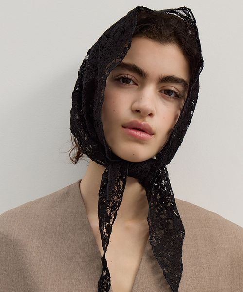 透け感のある繊細な花柄のレースが可憐な印象の三角スカーフ。