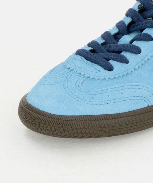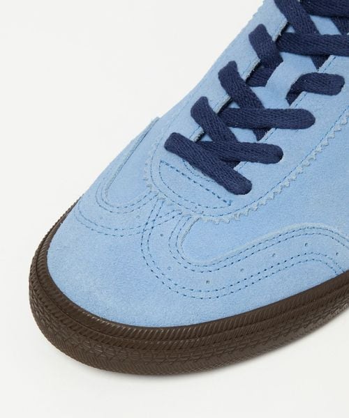鮮やかなライトブルーのアッパーに部分使いの赤や緑がアクセントになる一足。