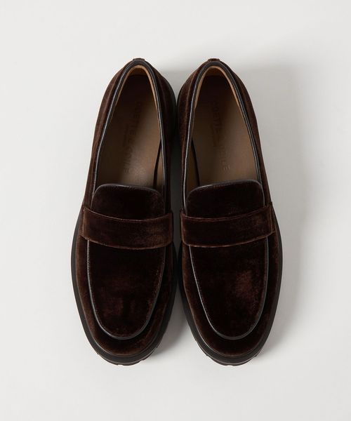 オーセンティックなローファーデザインにベルベット生地と控えめなタンクソールを組み合わせ、上品ながらも遊び心を添えたカジュアルなフラットシューズ。