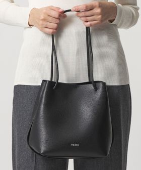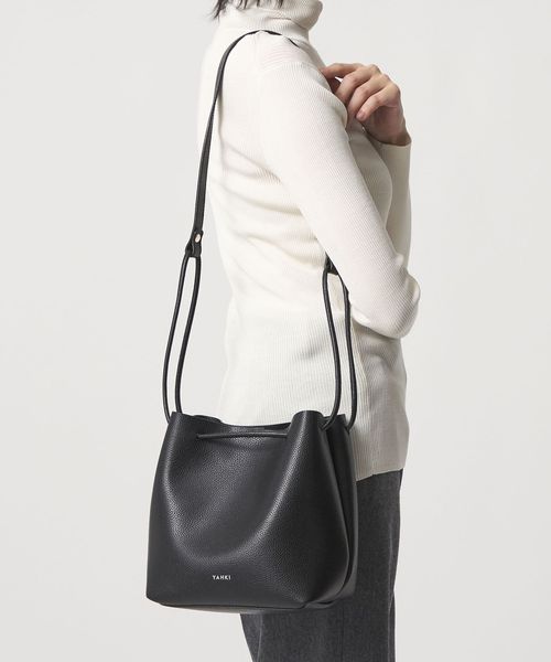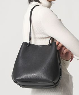 無駄を削ぎ落したミニマルな本体に、丸紐ハンドルとベルトディテールがアクセントを添えるバッグ。