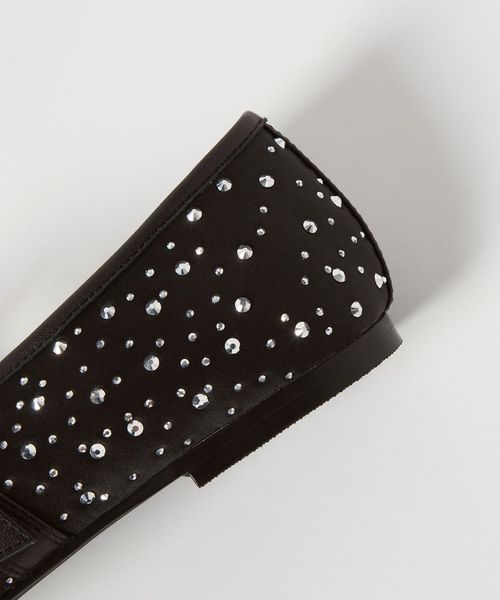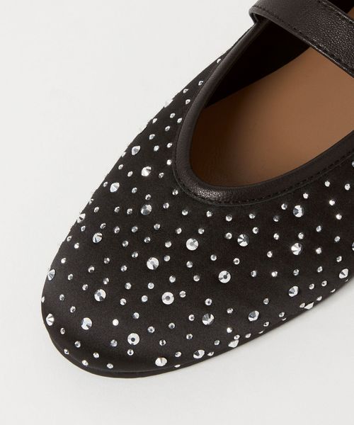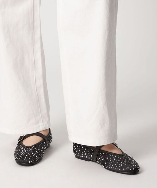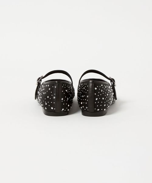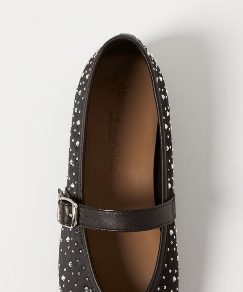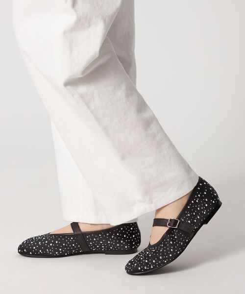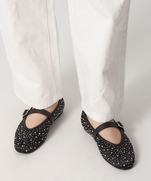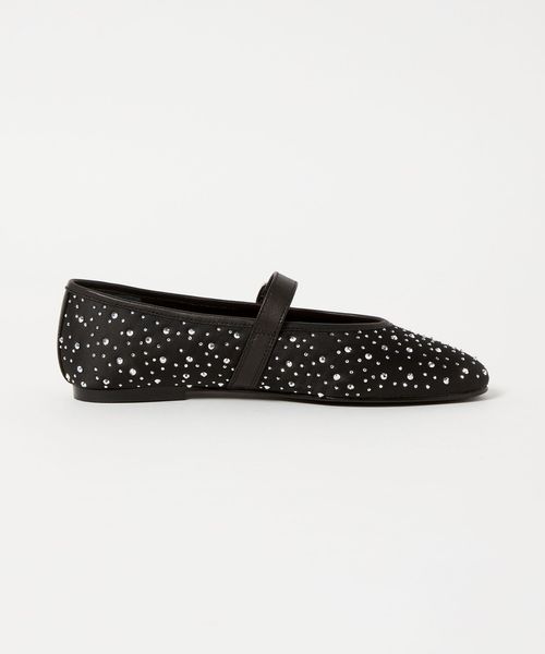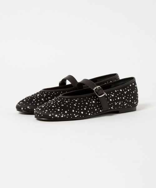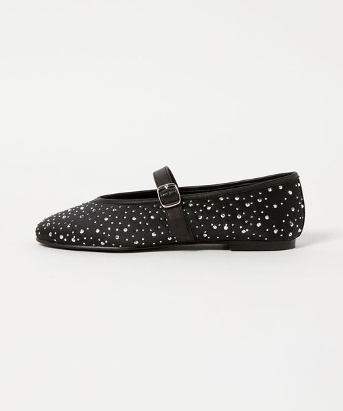 上品なサテン生地に大小異なるビジューを散りばめた、華やかさと繊細さが融合した一足です。